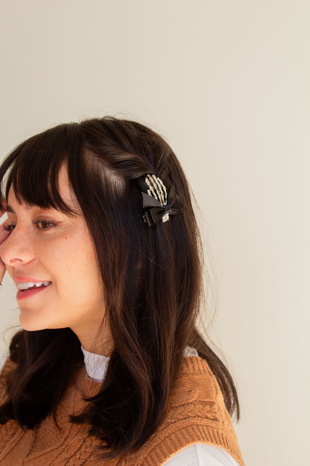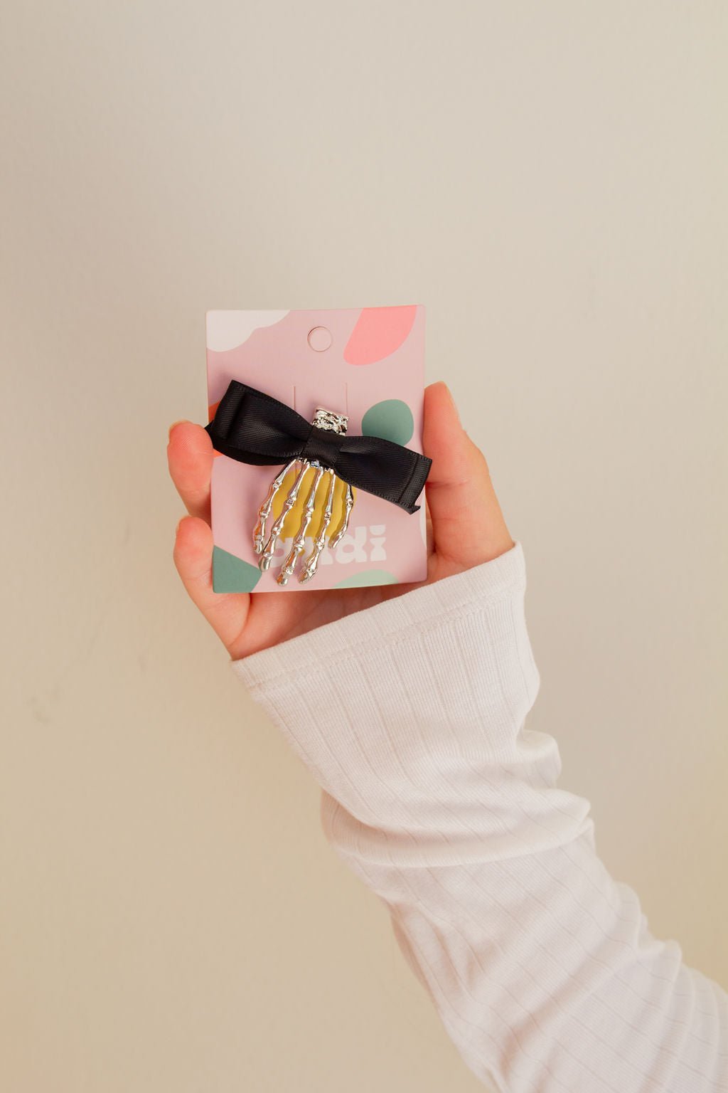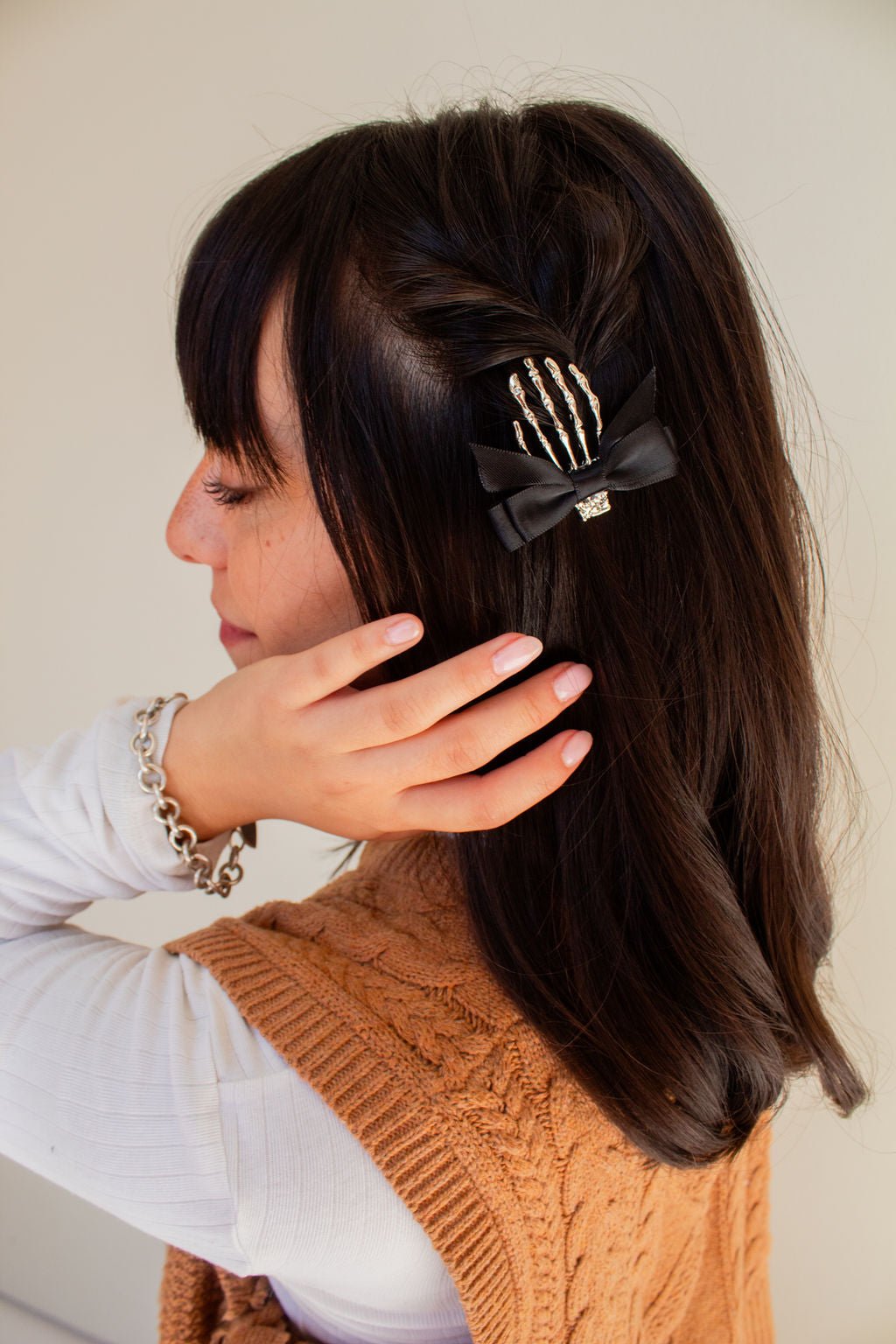 This silver skeleton hand is the cutest hair accessory for your Halloween wardrobe! it features an adorable bow at the base of the hand and an alligator clip, that helps keep your hair out of your face all day! You'll love having these clips around for this spooky season!