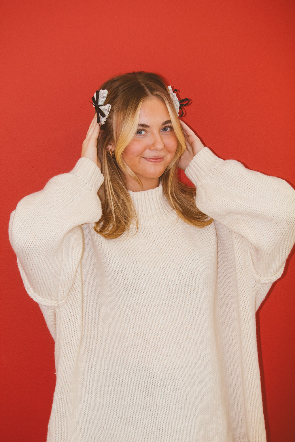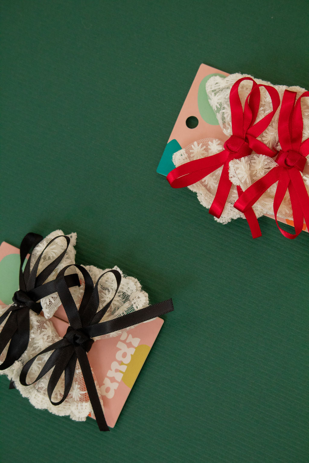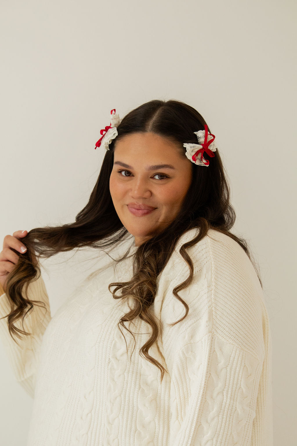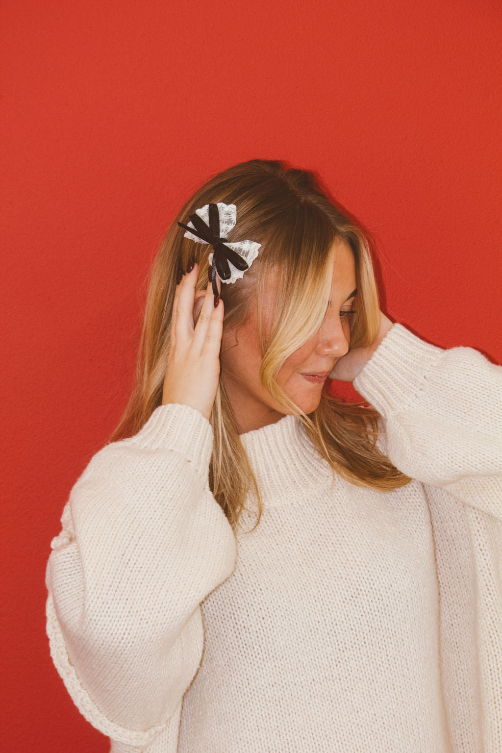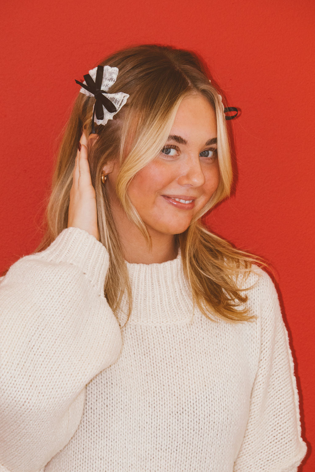 Our bows are the perfect mix of feminine, sophistication, and whimsy! This two-pack of bows is a must. Made with a gorgeous creamy lace + red or black ribbon they are to die for cute and are so easy to apply with the alligator clip. Elevate any look instantly with these adorable Andi Bows.