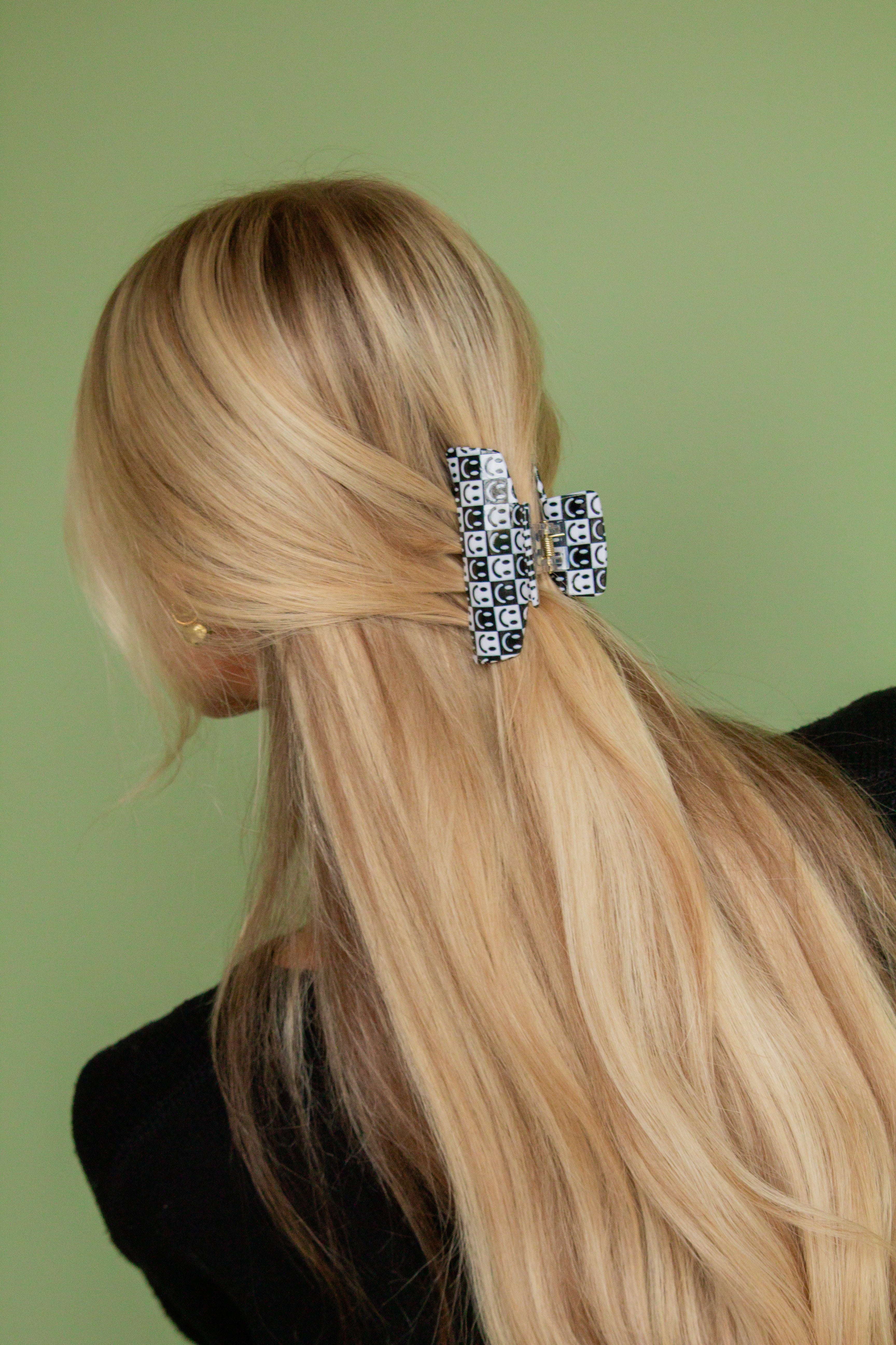 These adorable black and white checkered claw clips are the perfect size, and are the absolute vibe for this time of year! The best way to elevate your updo for the day. These are medium sized claw clips measuring at 3 inches.