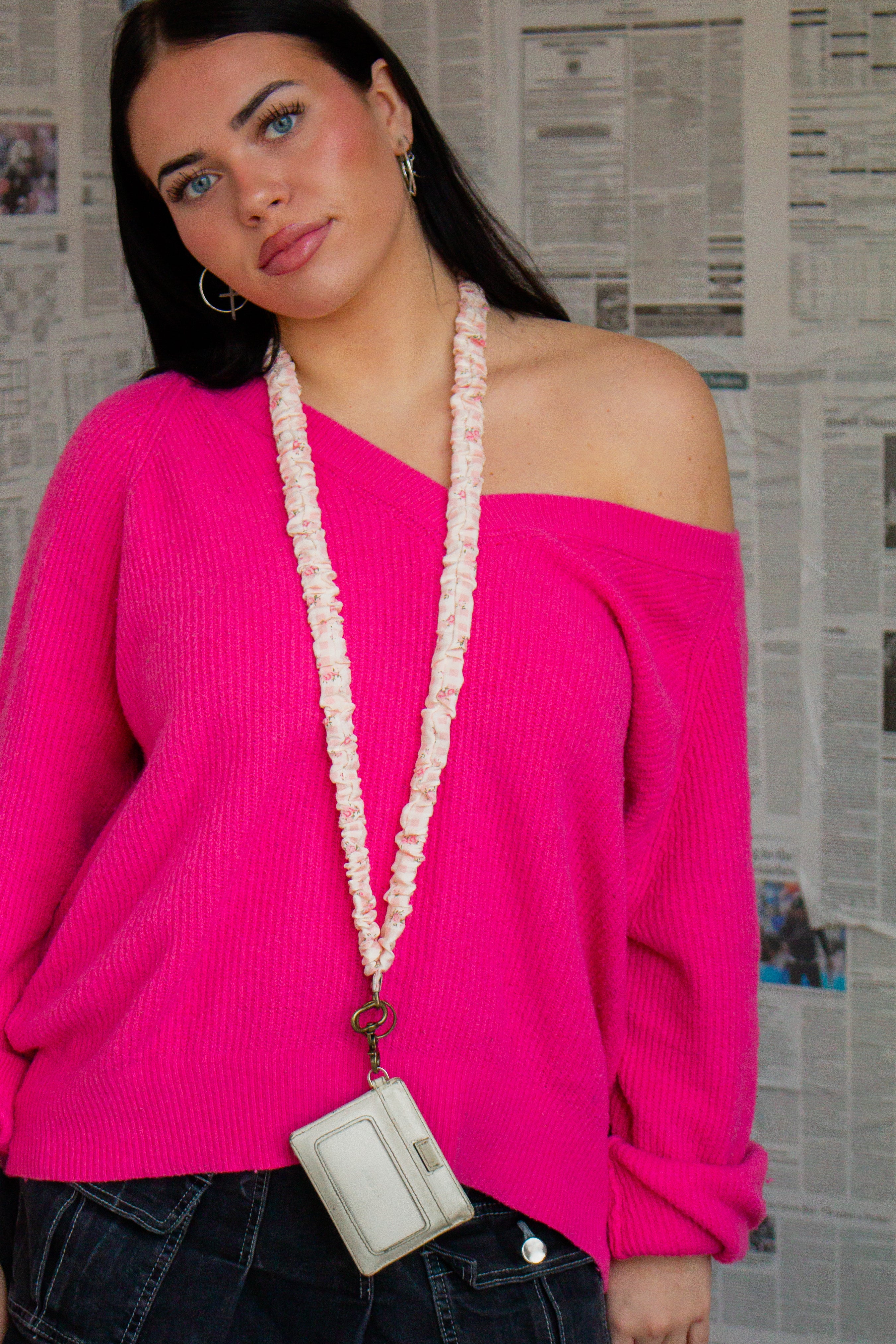 This lanyard is the cutest addition to your Valentine's collection. It's the perfect pink and cream gingham, while also being the most darling floral. We're obsessed! This is our regular sized lanyard and measures around 19.25 inches!