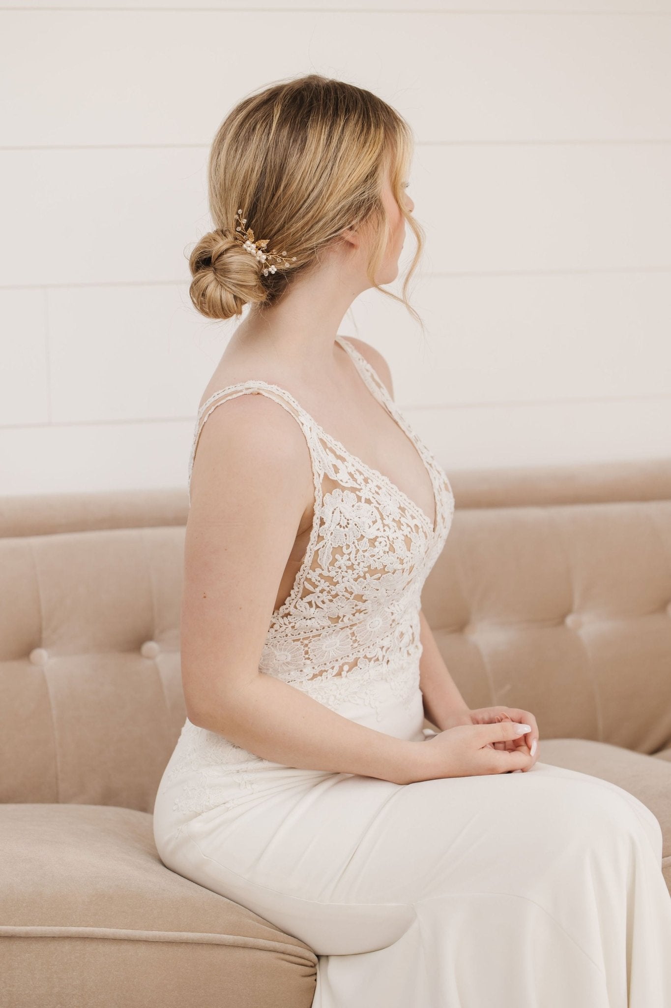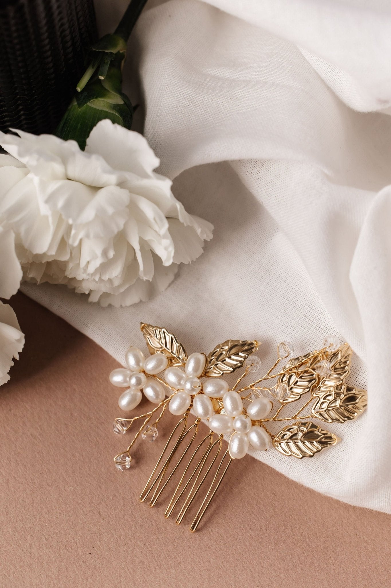 Flori is a comb with three pearl flowers surrounded with a few gold leaves and crystals. She is so stinking cute!