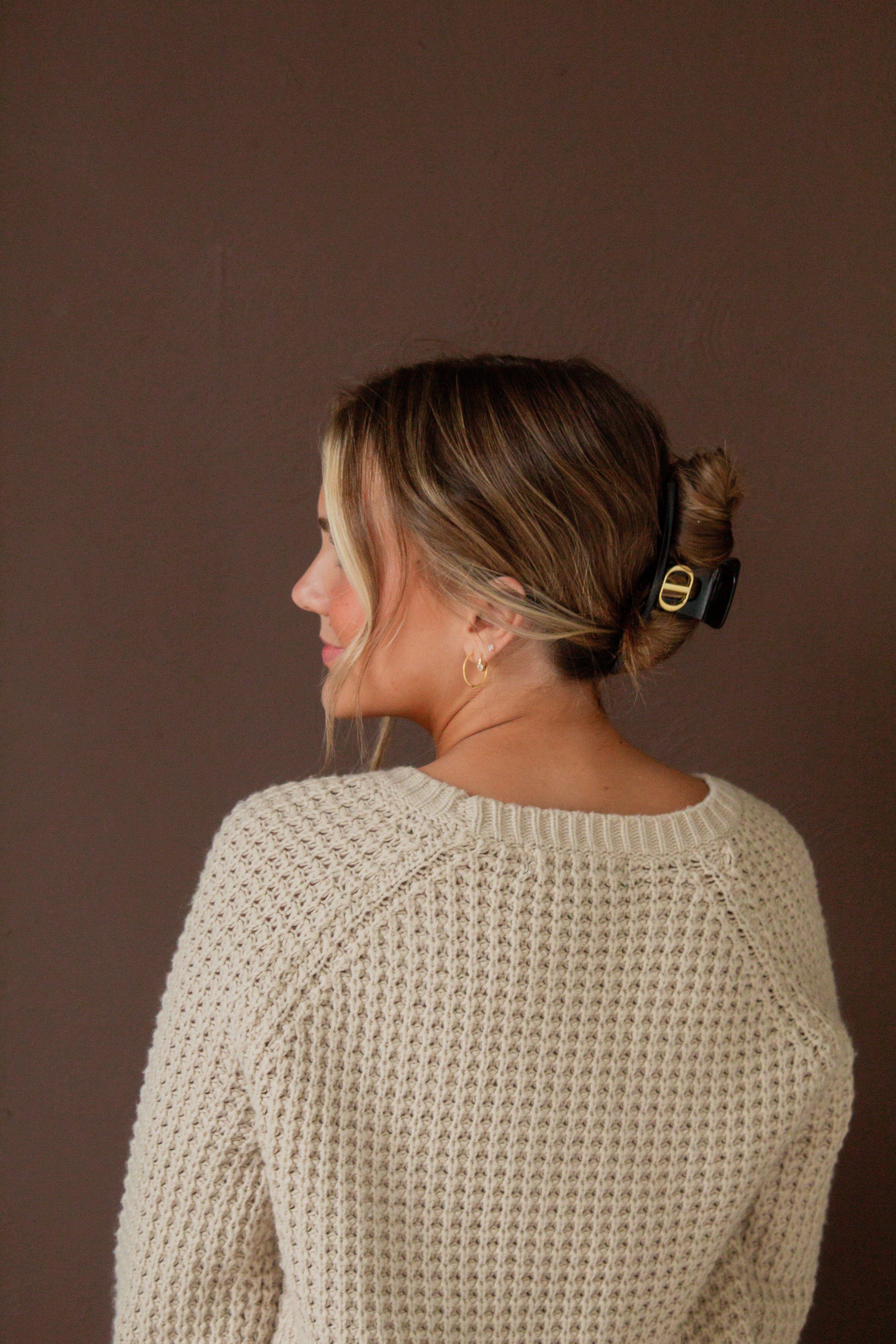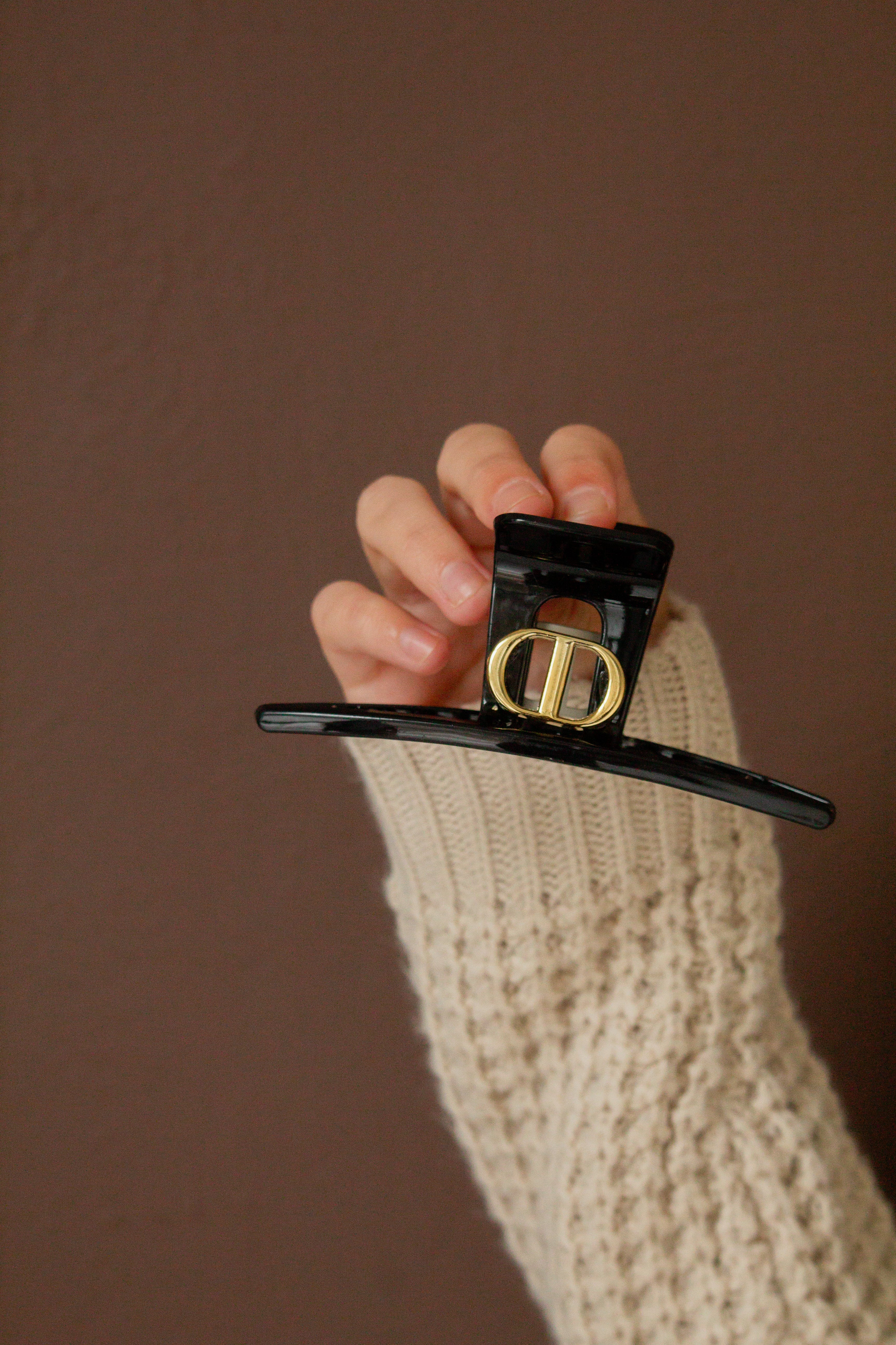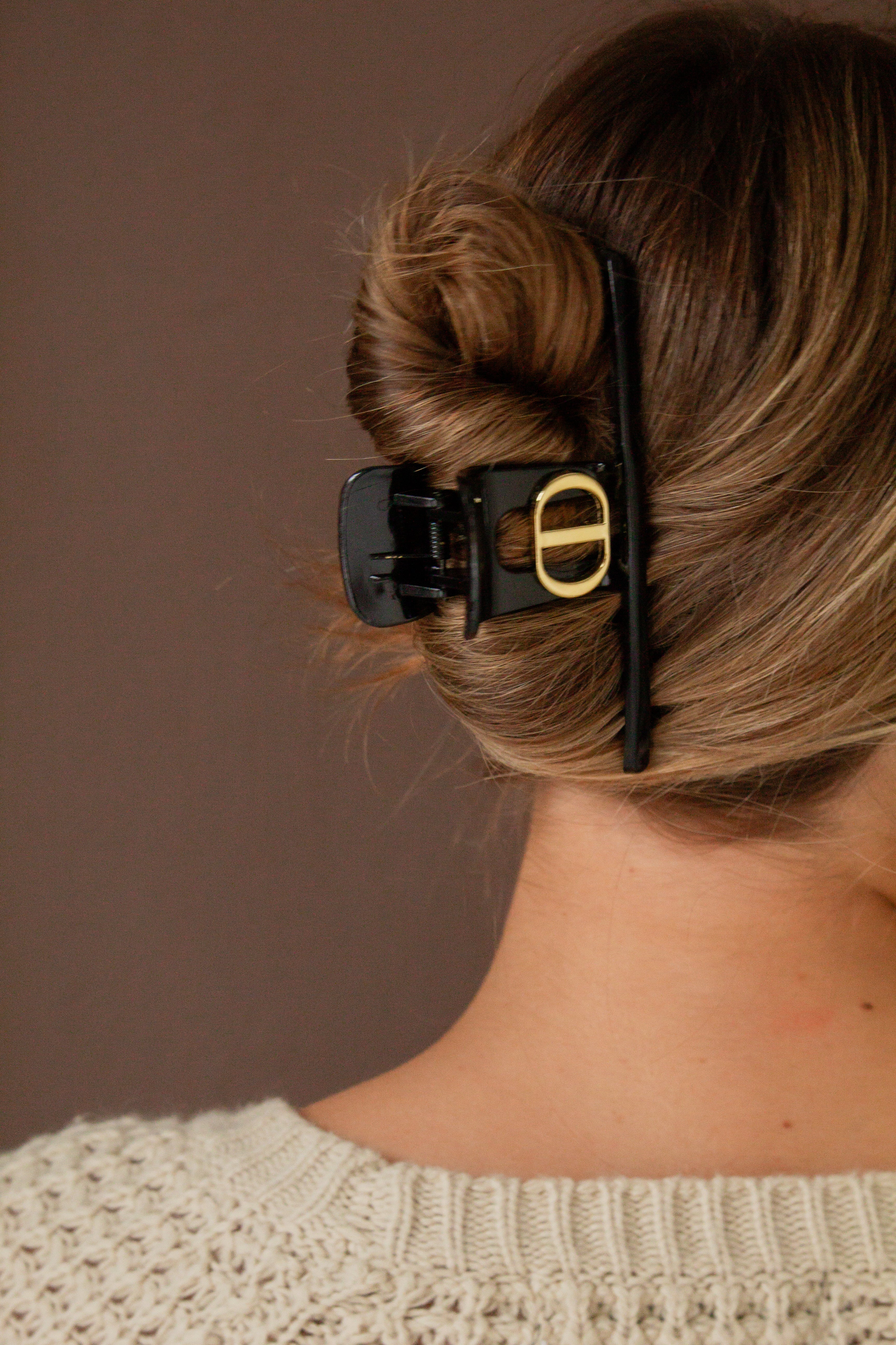 This adorable & unique claw clip is the perfect size, and is an absolute vibe for this time of year! It's the cutest black sturdy black claw clip with the prettiest gold tab detail. The best way to elevate your updo for the day. This is an XL size claw clip measuring at 5 inches.