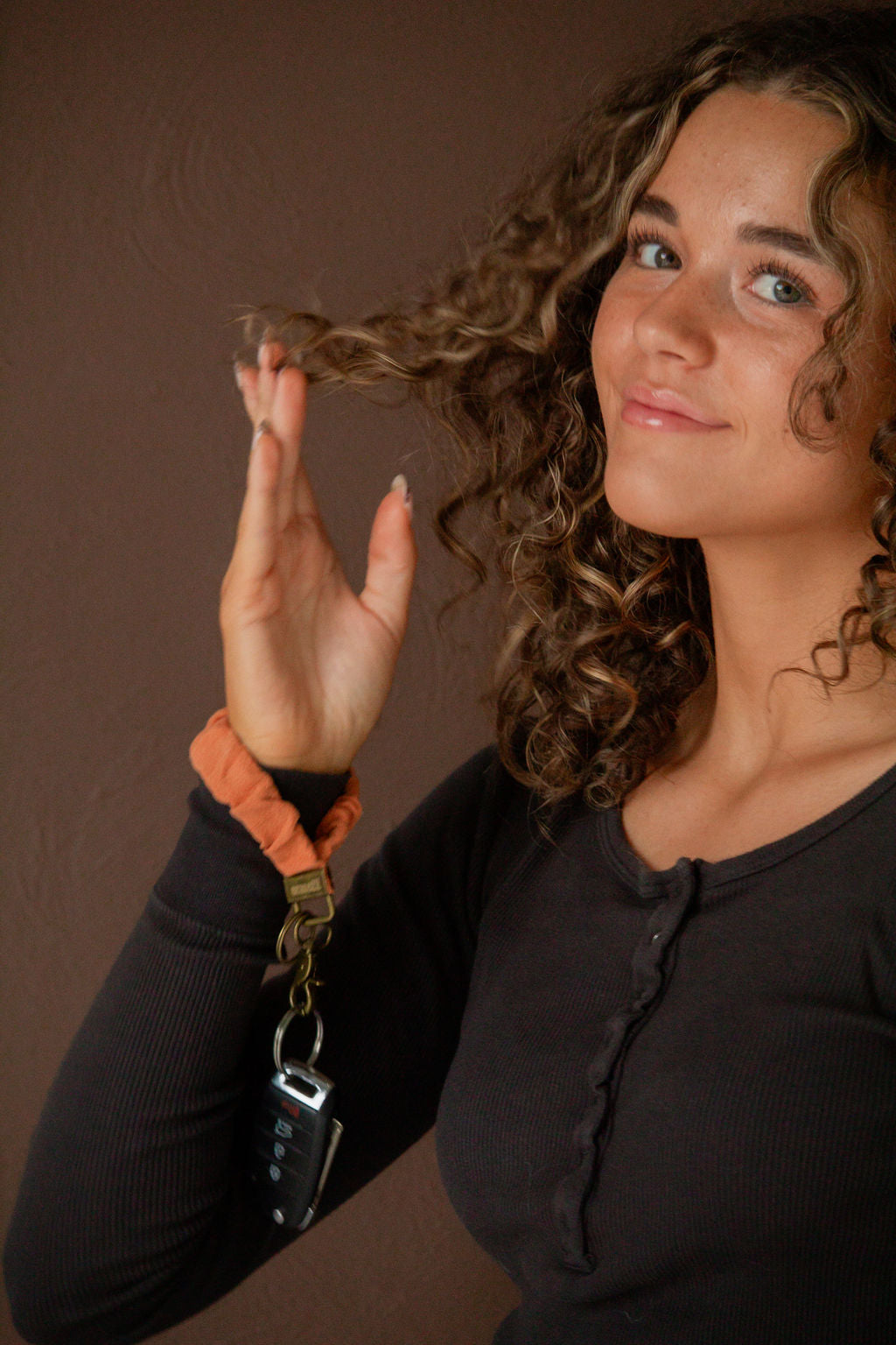 Andi keychains are the cutest you'll find! This keychain is the prettiest pumpkin spice orange color in a nice, slightly textured, linen-like fabric. This one will be perfect for the Fall & Halloween season. You can't go wrong with this one--it'll look cute with all your outfits! Get this to hold all your necessities and keep your pockets and hands free while adding a cute and stylish flair.