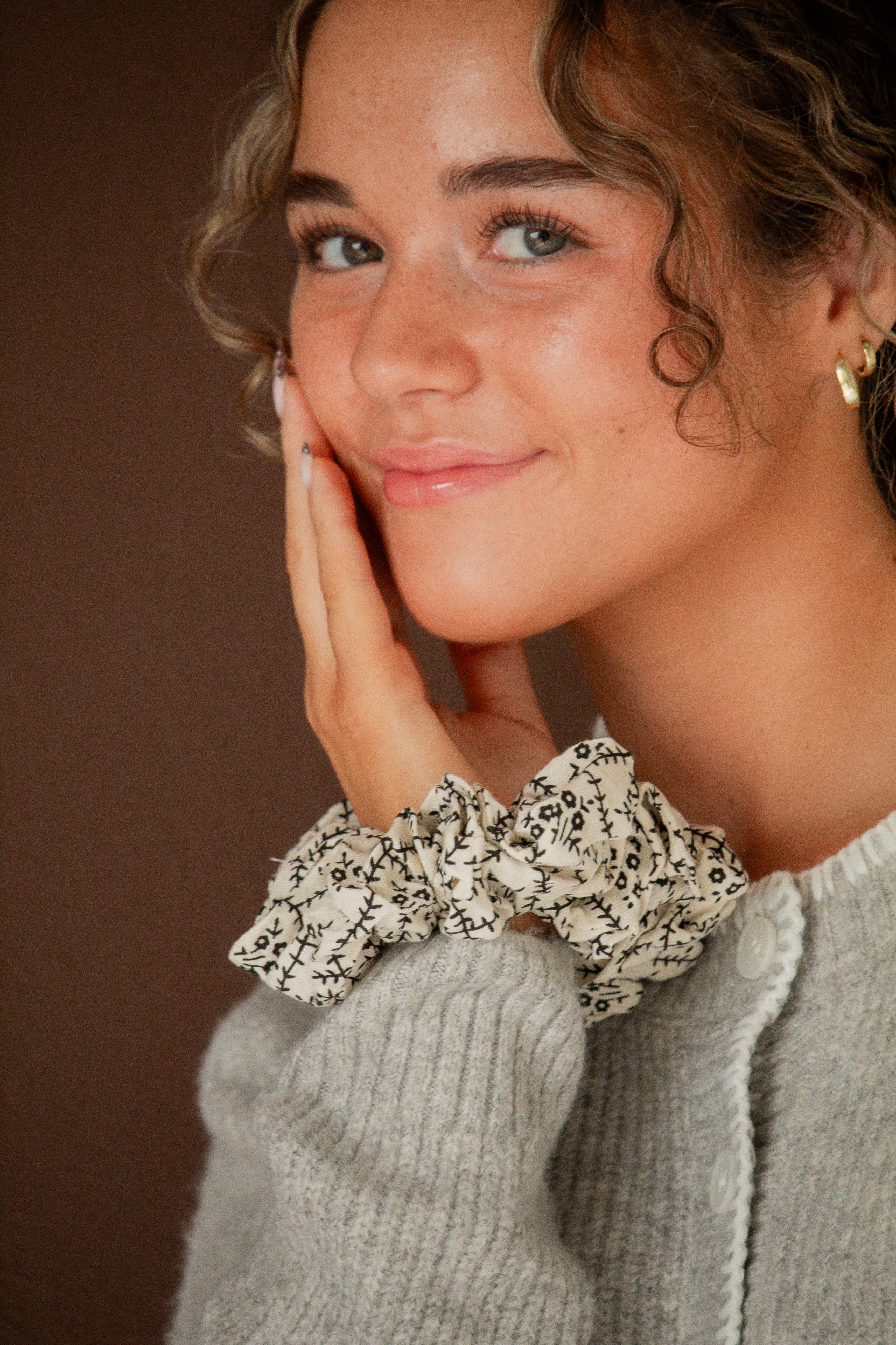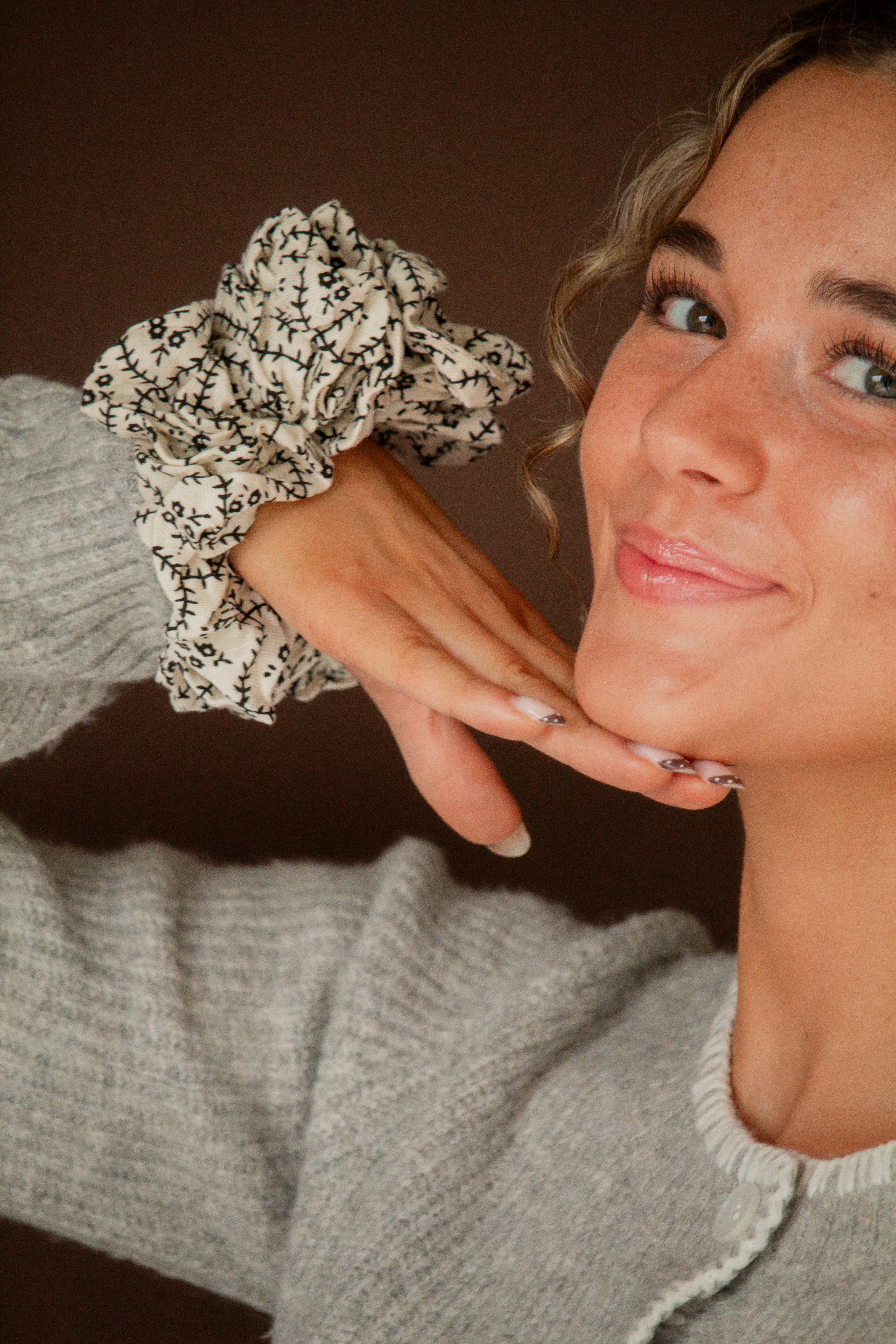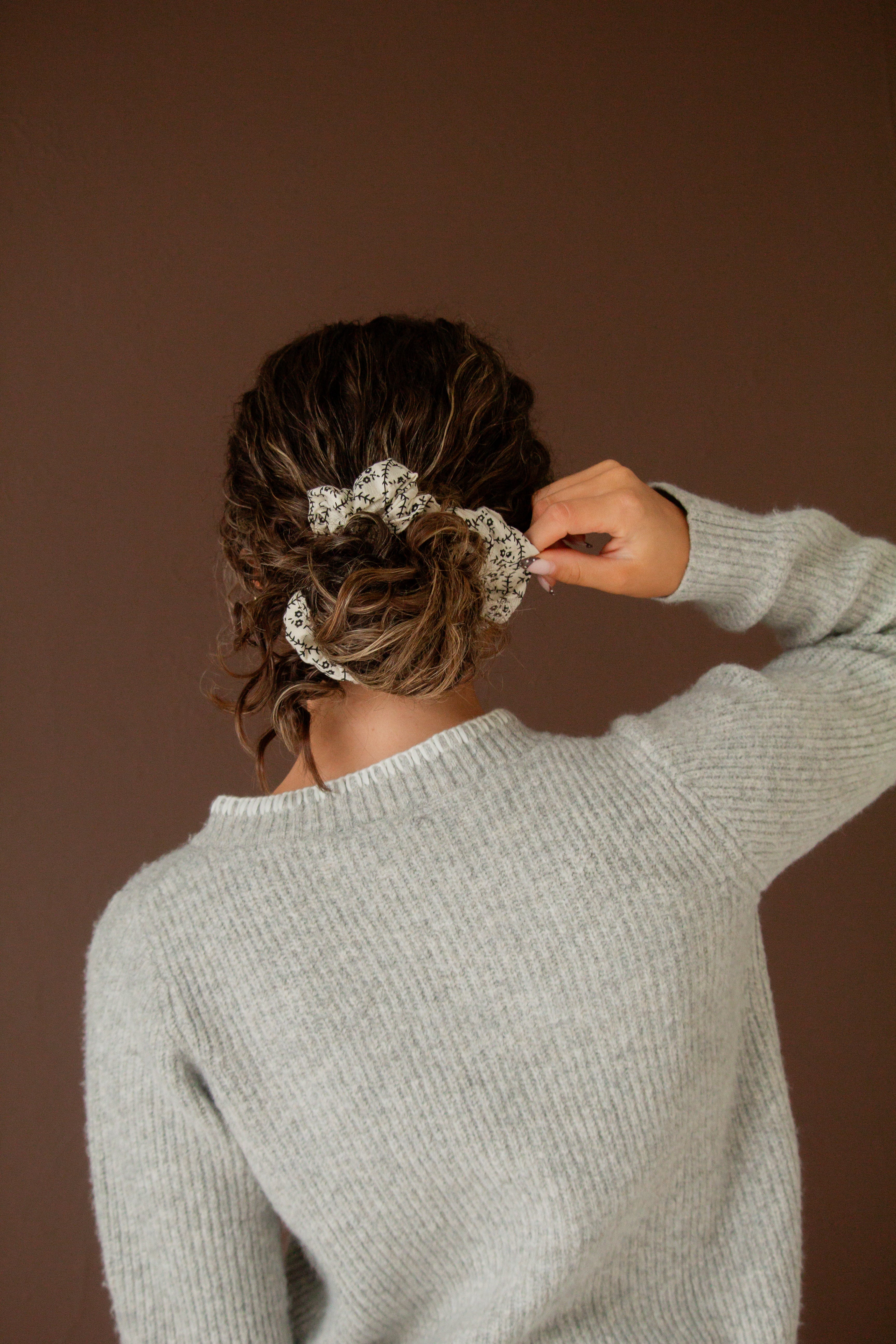 This jumbo scrunchie is the the cutest subtle floral print in black and cream in a nice, slightly textured fabric. The absolute best scrunchie to have in your Halloween accessory collection and the cutest addition to your hairstyles this season, and all year round.
