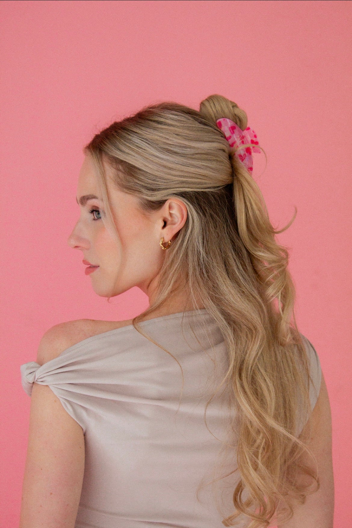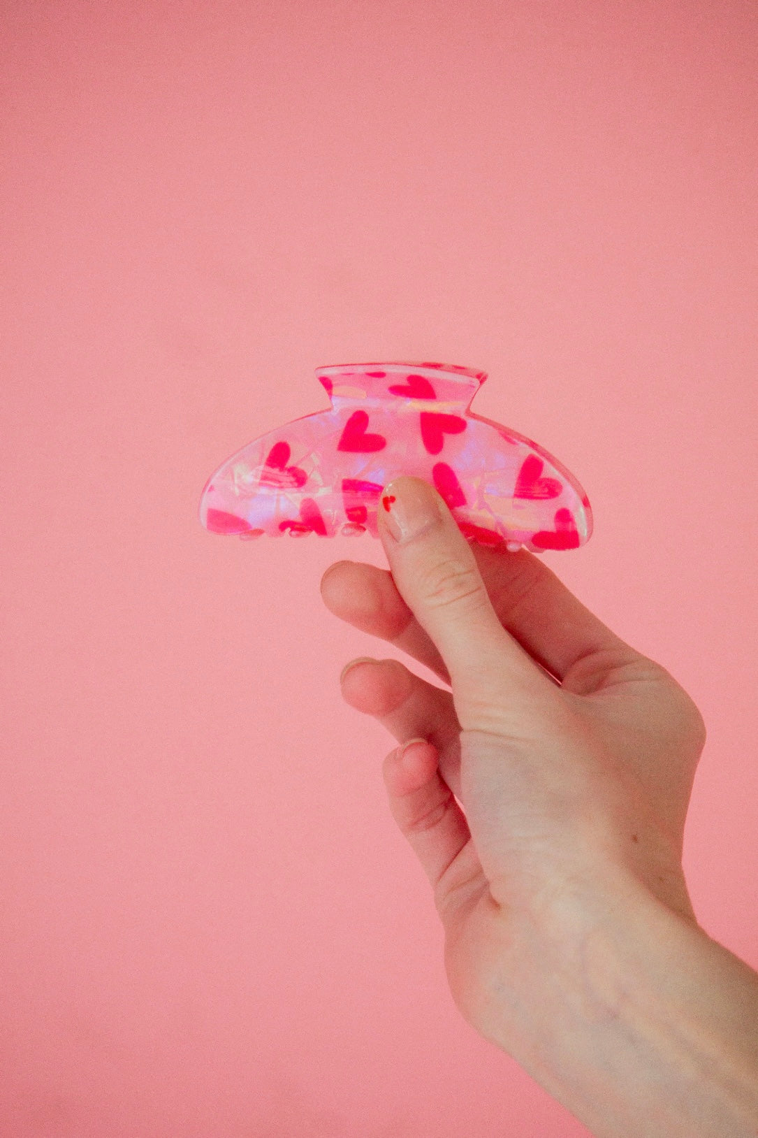 This is a medium size claw clip measuring at 3.5 inches, and is absolutely adorable. It’s the prettiest pink color with hearts throughout—the perfect clip for Valentine’s Day, and is so fun and unique!