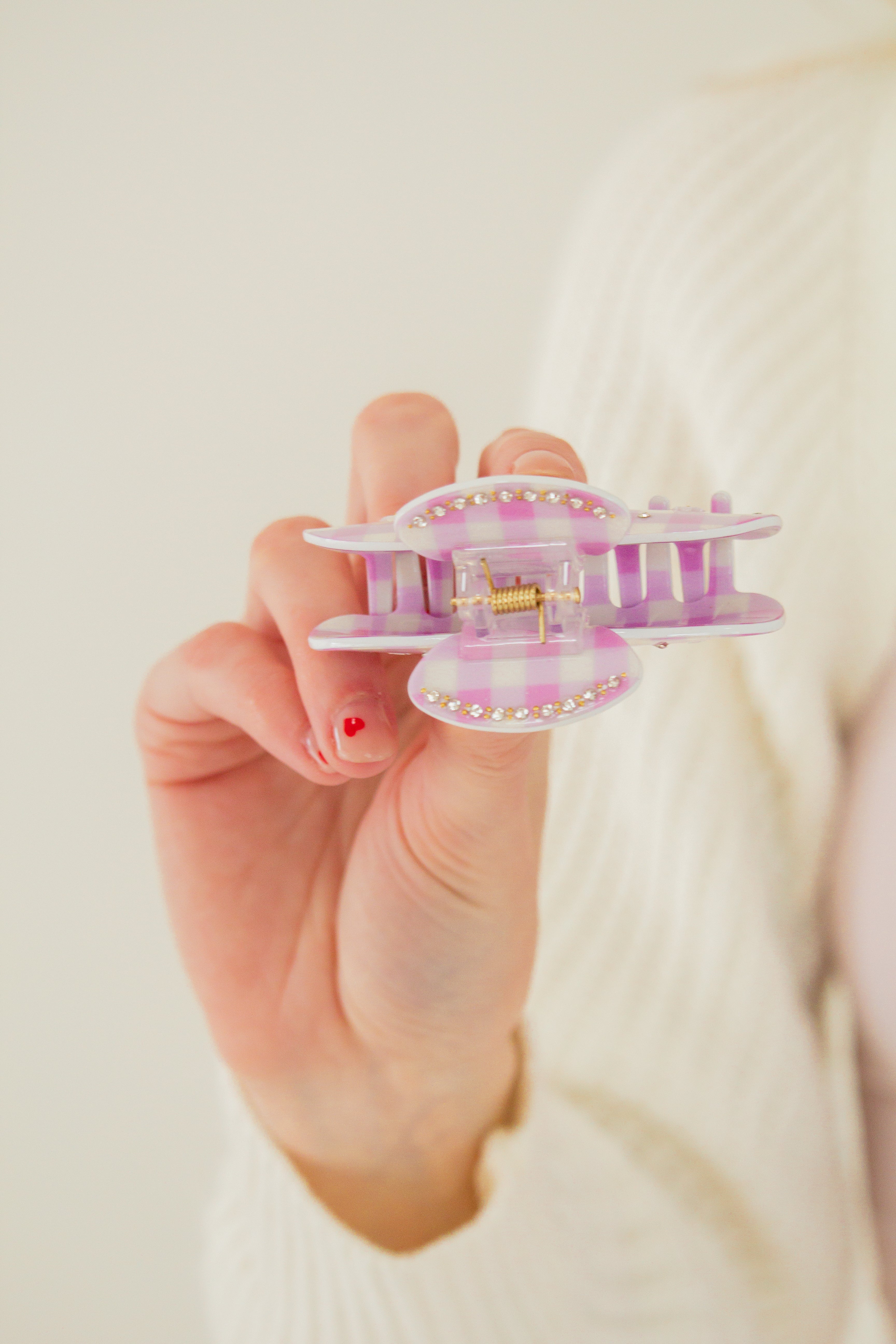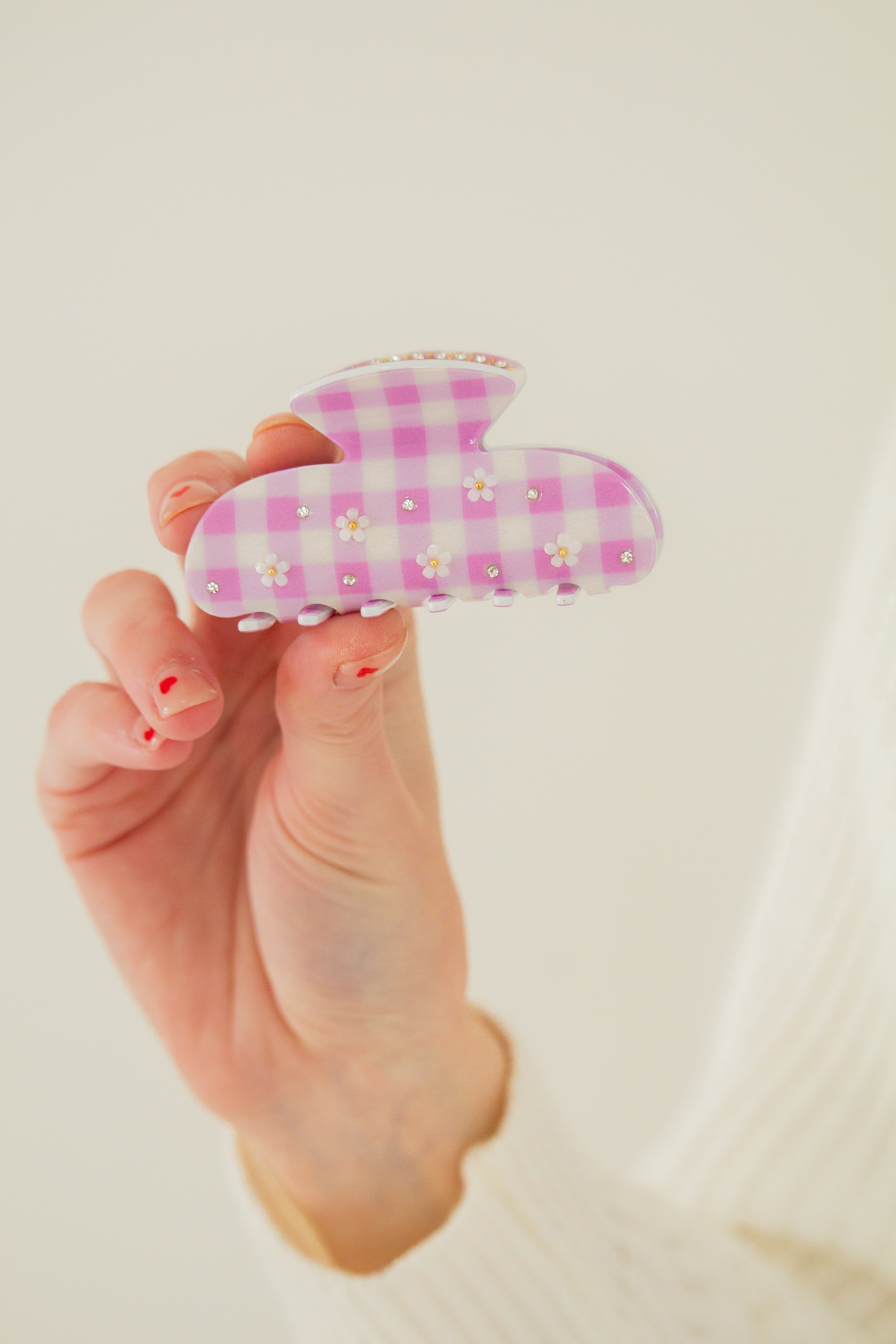This is a medium size claw clip measuring at 3 inches, and is absolutely adorable. It’s the cutest gingham with daisy details—the perfect clip for Valentine’s Day, and is so fun and unique!