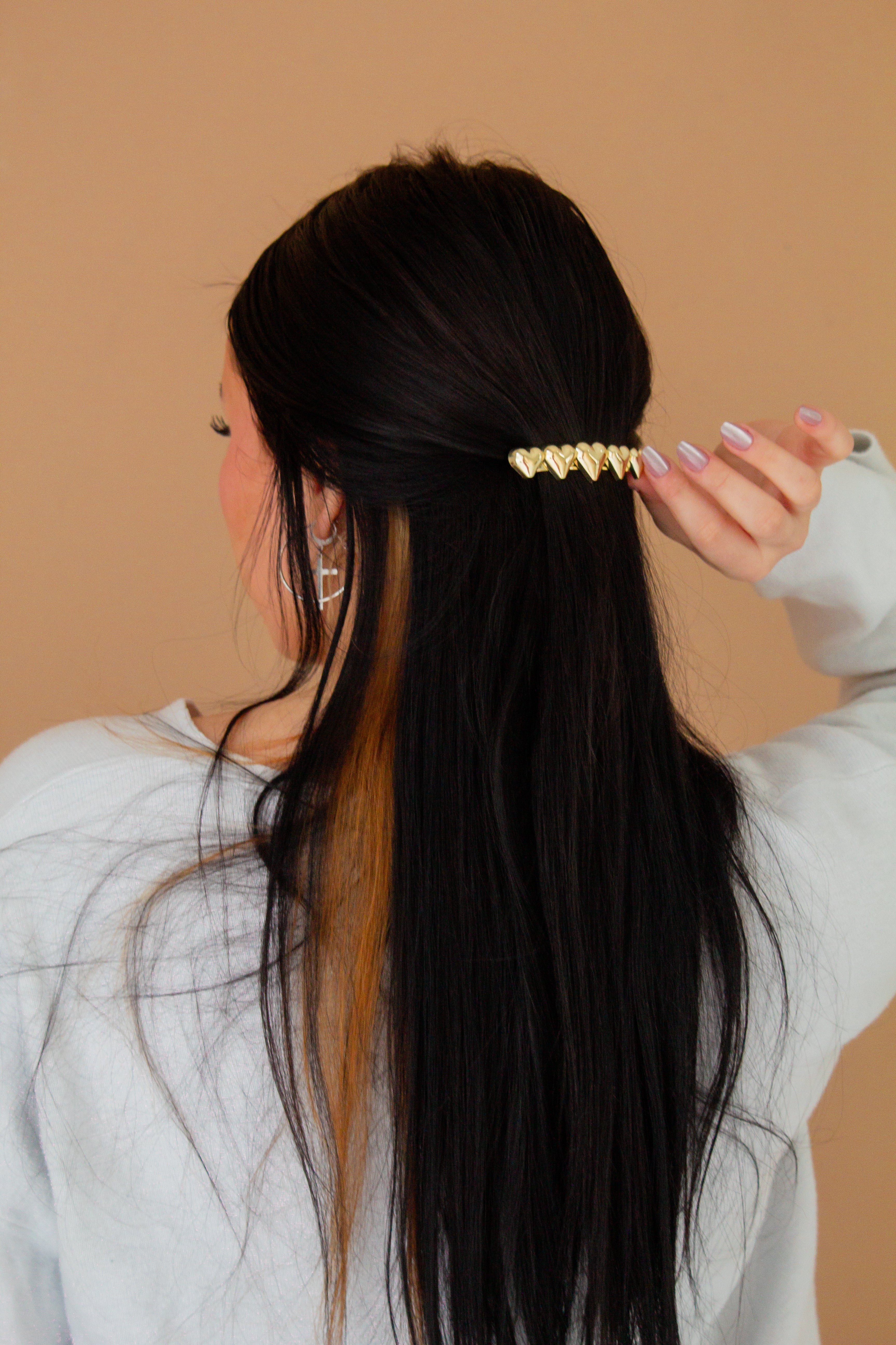 This barrette is to die for, and is so perfect for every hairstyle and outfit. The prettiest dainty piece with 5 gold hearts--the best accessory to add to any hairstyle for a little something extra.