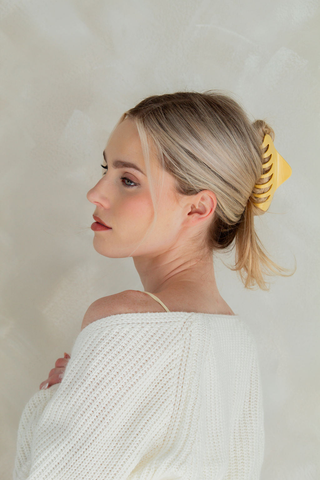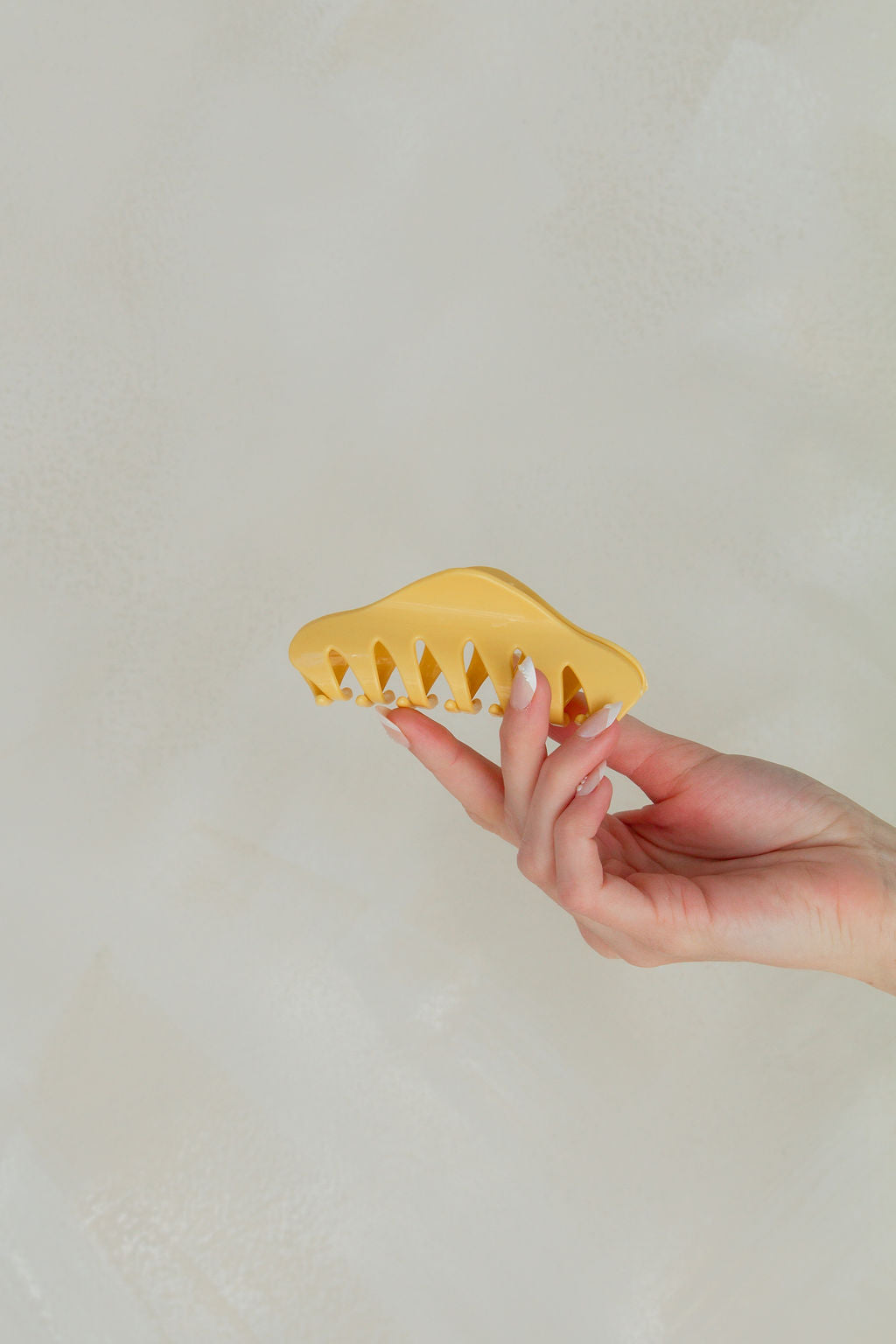 This is a large size curved claw clip measuring at 4 inches, and is absolutely adorable. It comes in the most stunning light yellow color!