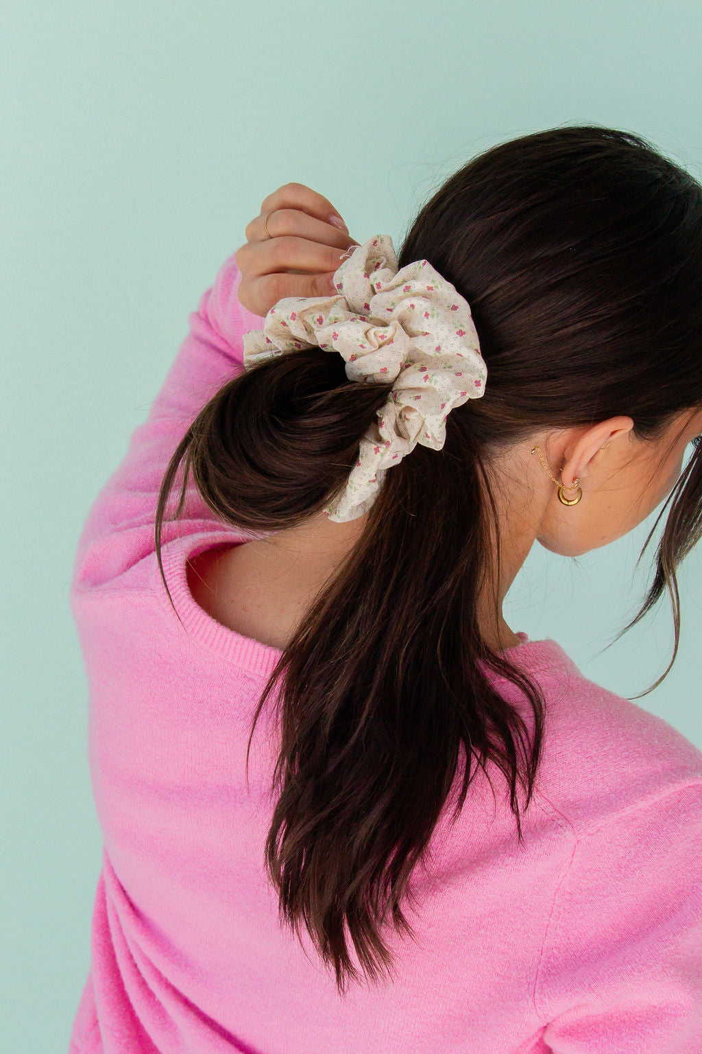 This jumbo has the cutest floral print. It has a purple and red flower pattern with little purple dots throughout on a cream background. I love this scrunchie for spring.