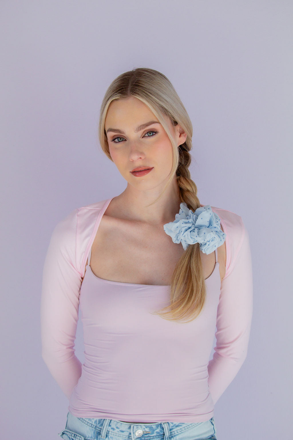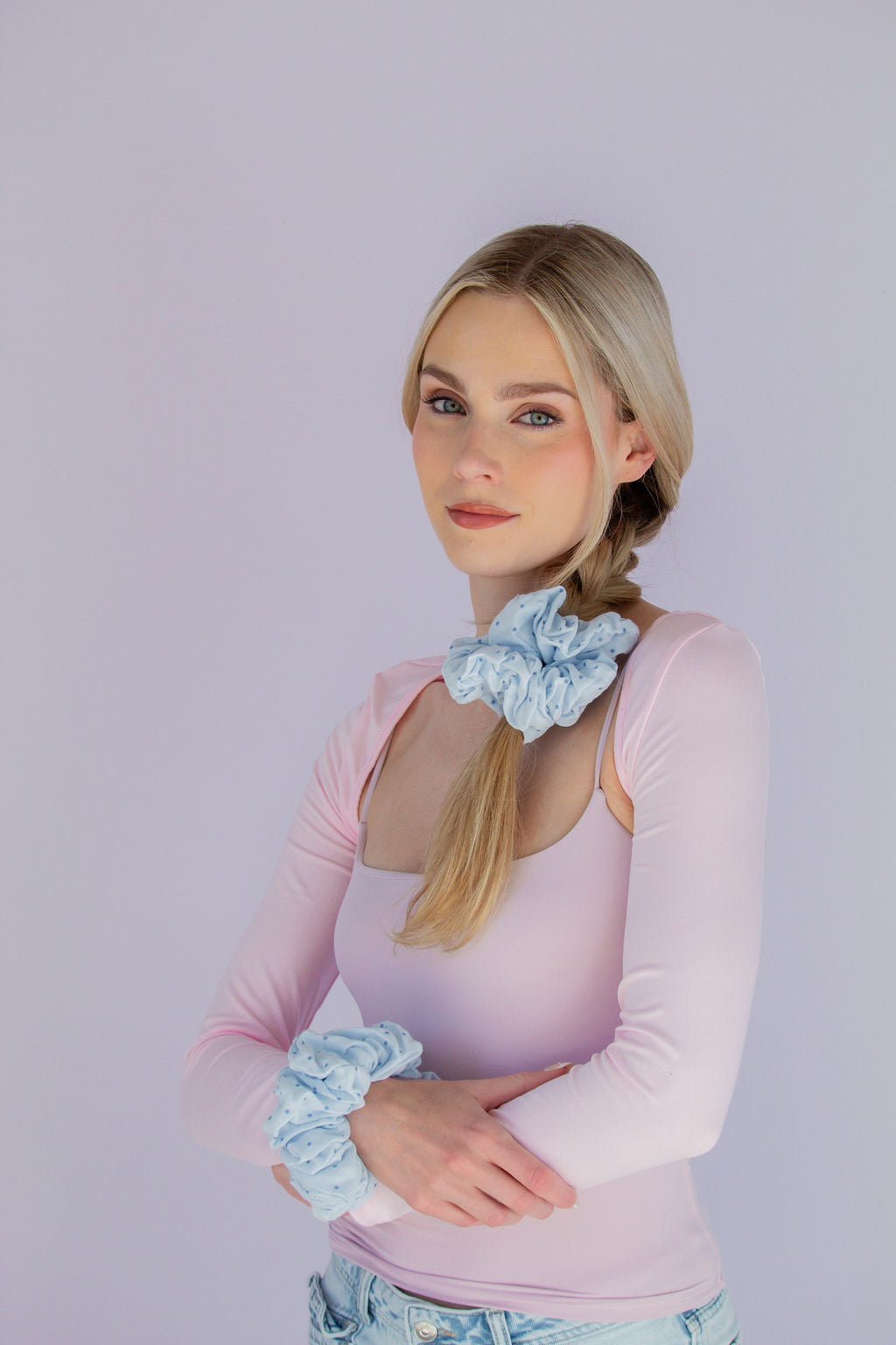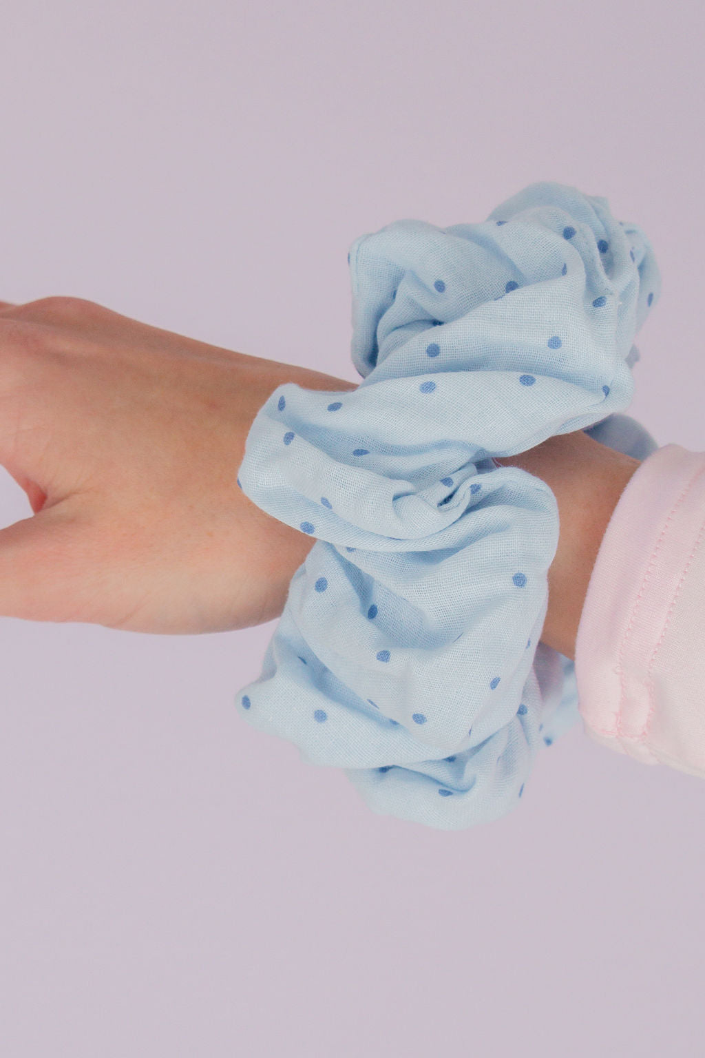 This jumbo is made out of a super soft linen-like light blue fabric with darker blue polka dots. Polka dots are the cutest trend right now and we think this scrunchie is no exception.