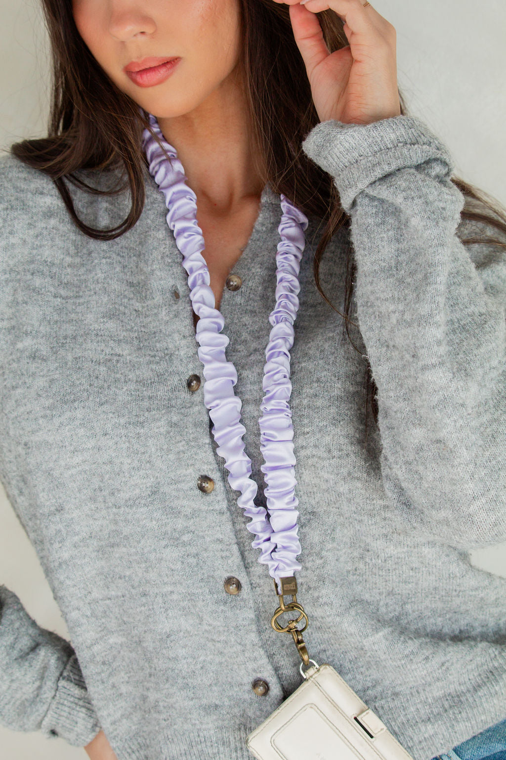 This lanyard is the prettiest light purple color in an soft, effortless satin fabric. We're obsessed! This is our regular sized lanyard and measures around 19.25 inches!