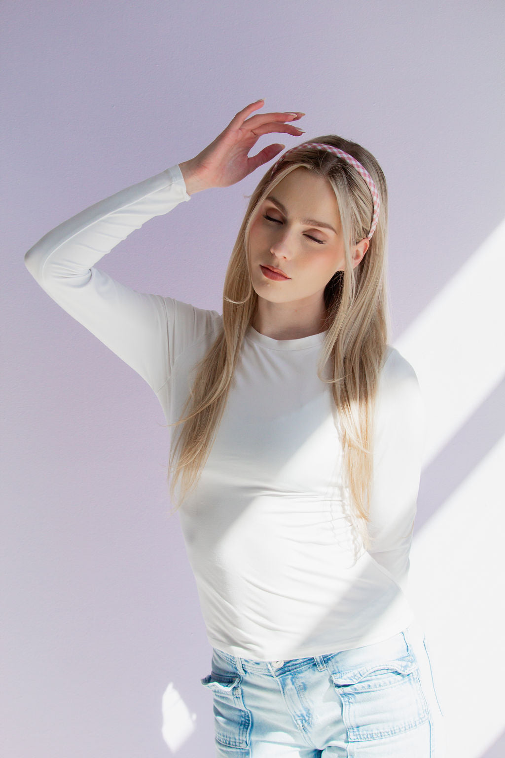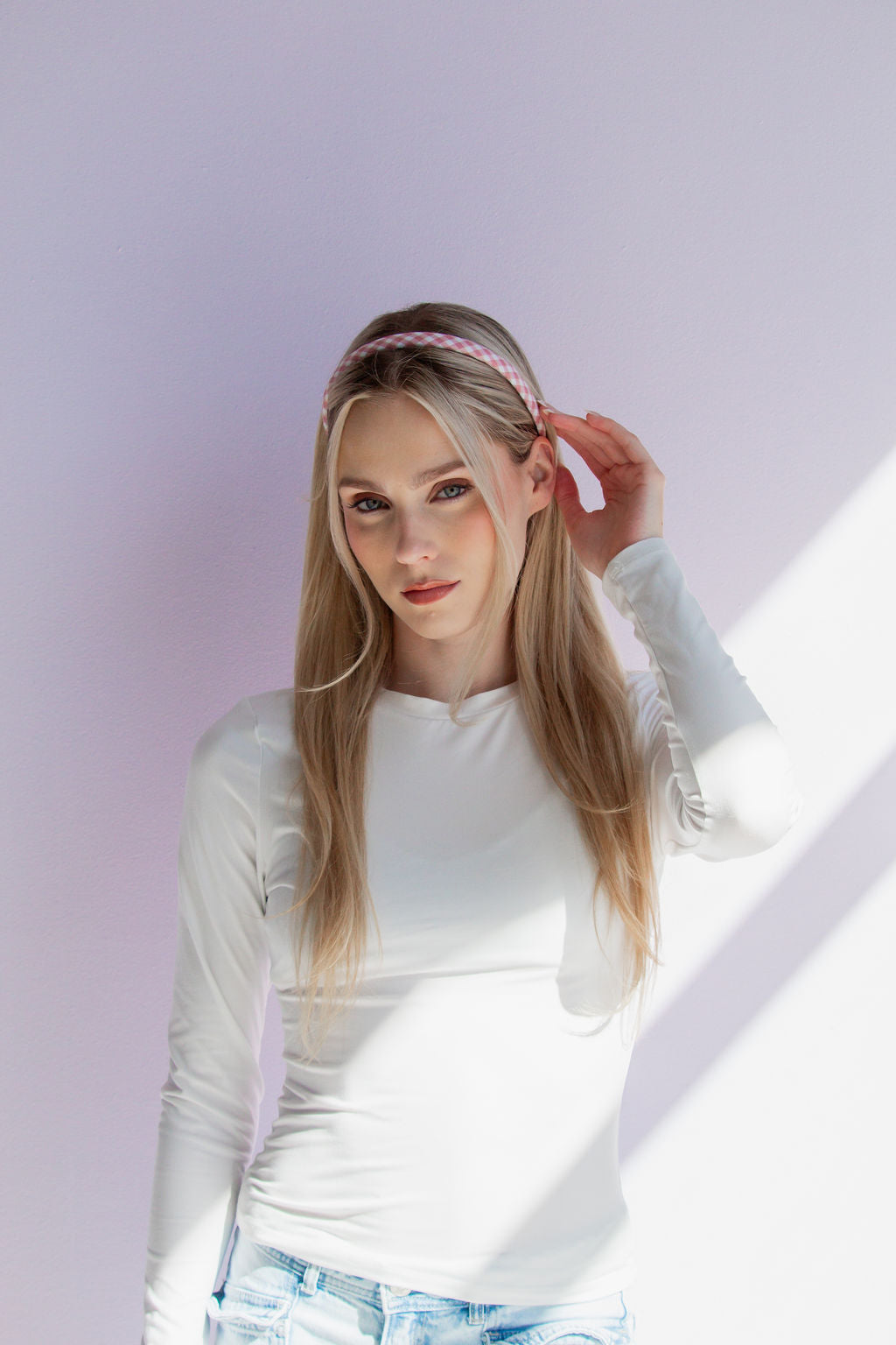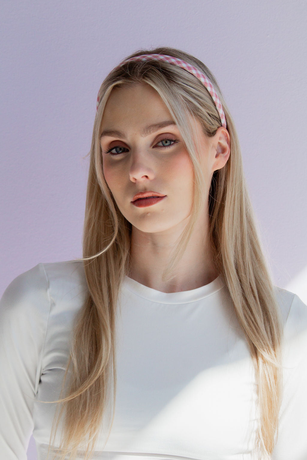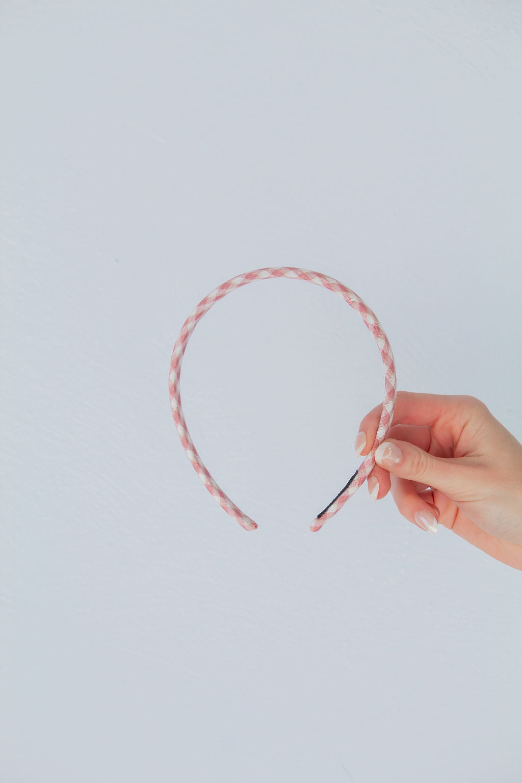 This headband is a true stunner with the light mauve colored checkers, I love it soooo much. Absolute perfection for this time of year! It is .5 inch wide!