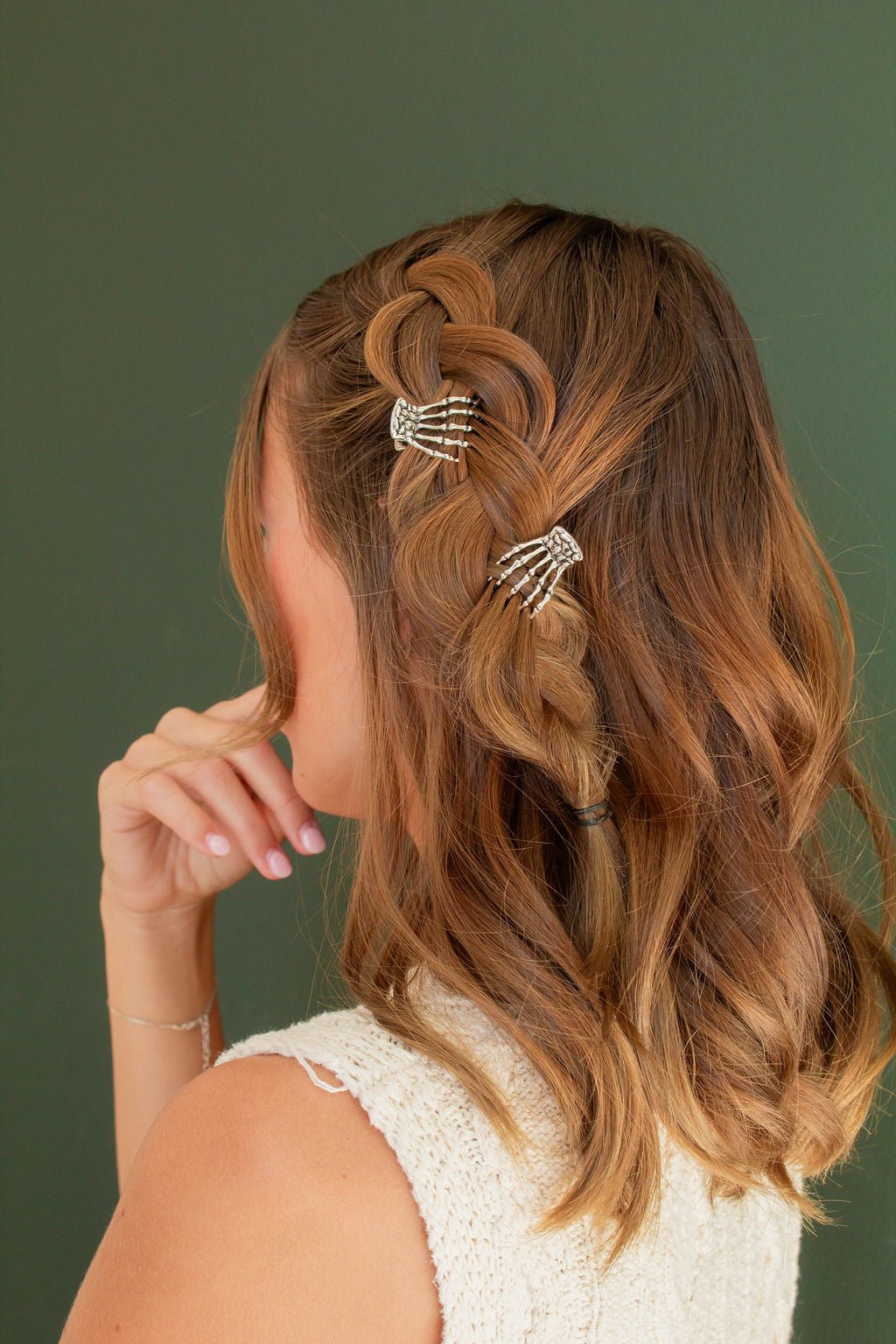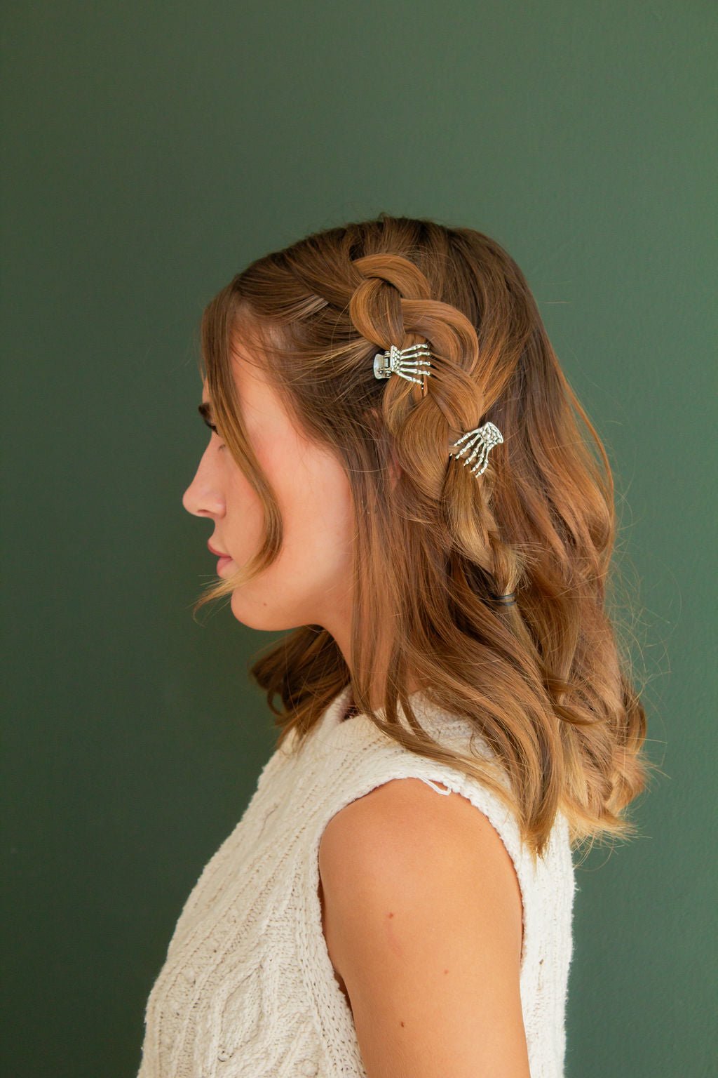 This 2-pack of mini skeleton hand claw clips is a must for your accessory bag! Our clips put a beautiful Andi touch on the hair clips you thought you knew. These are perfect for this spooky season and will pair with your favorite sweats, date night dress, or work fit!