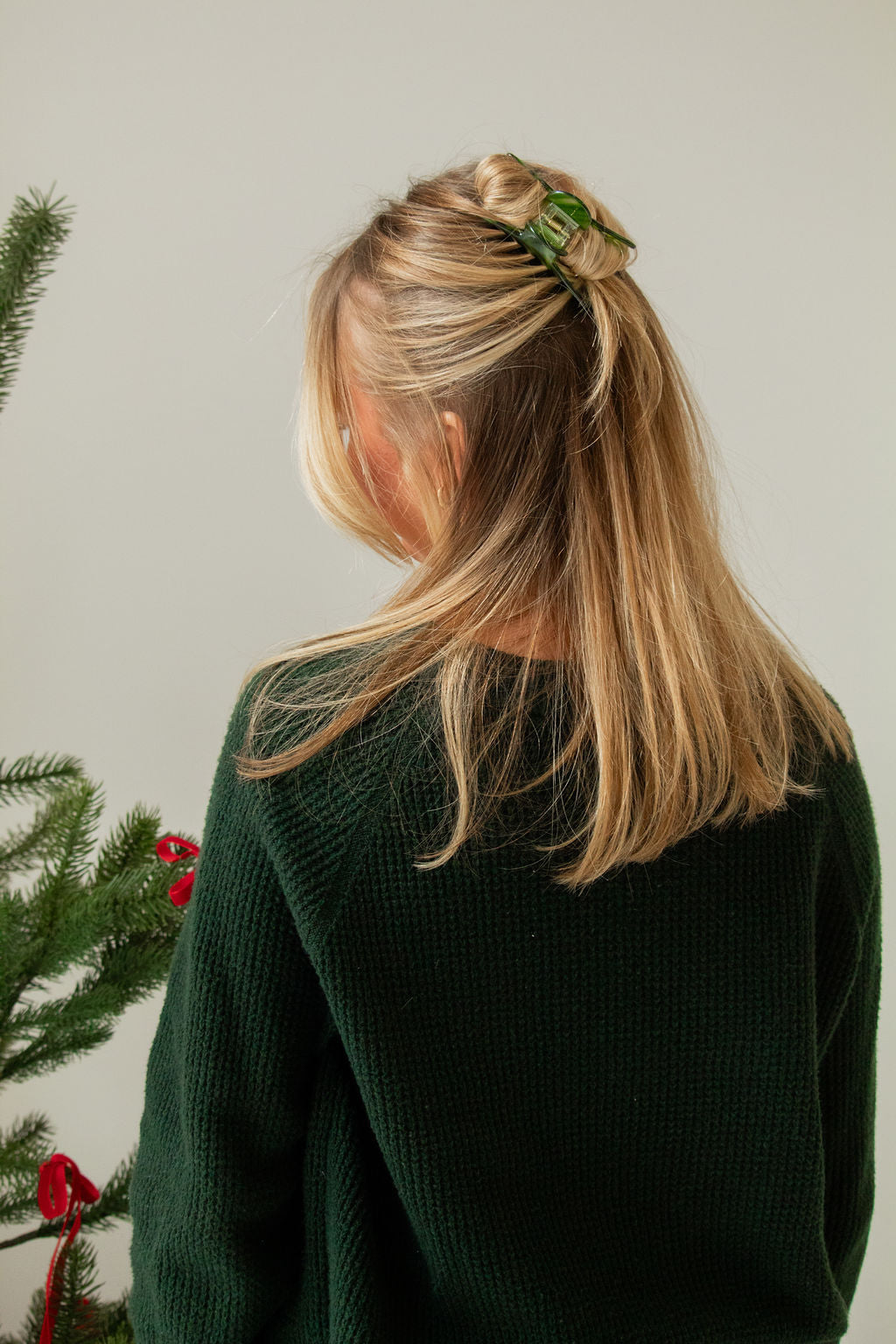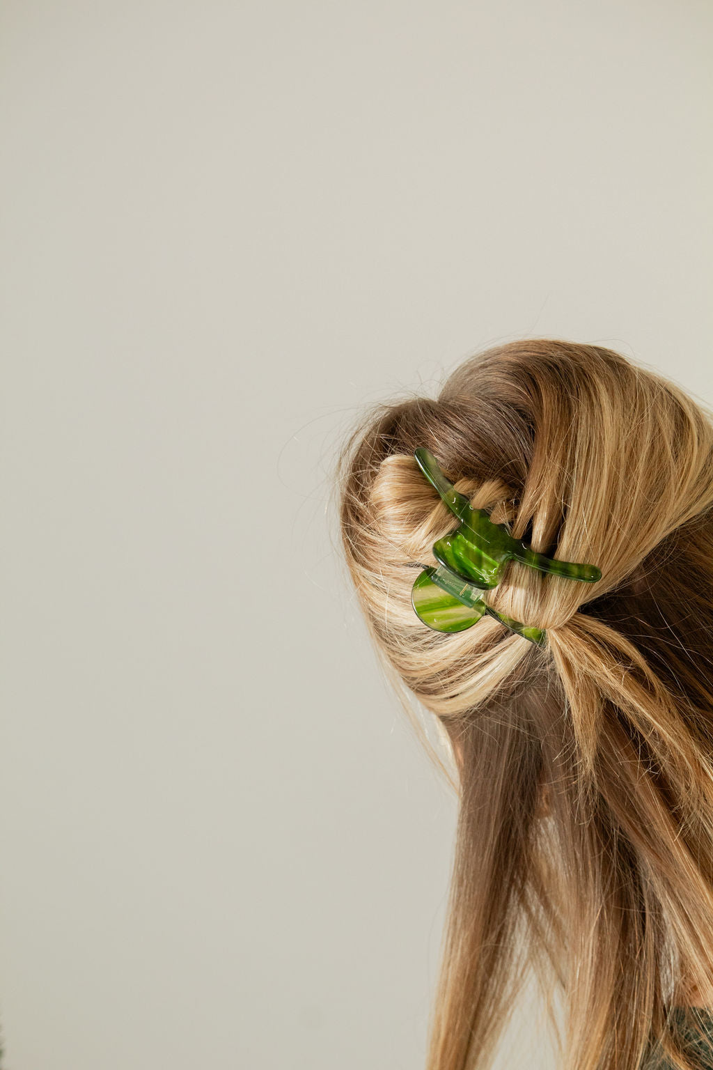 This is a medium size claw clip measuring at 3.5 inches and comes in a gorgeous marbled green color. It is made out of a high quality acetate material and will be your new go to claw for an easy half up!