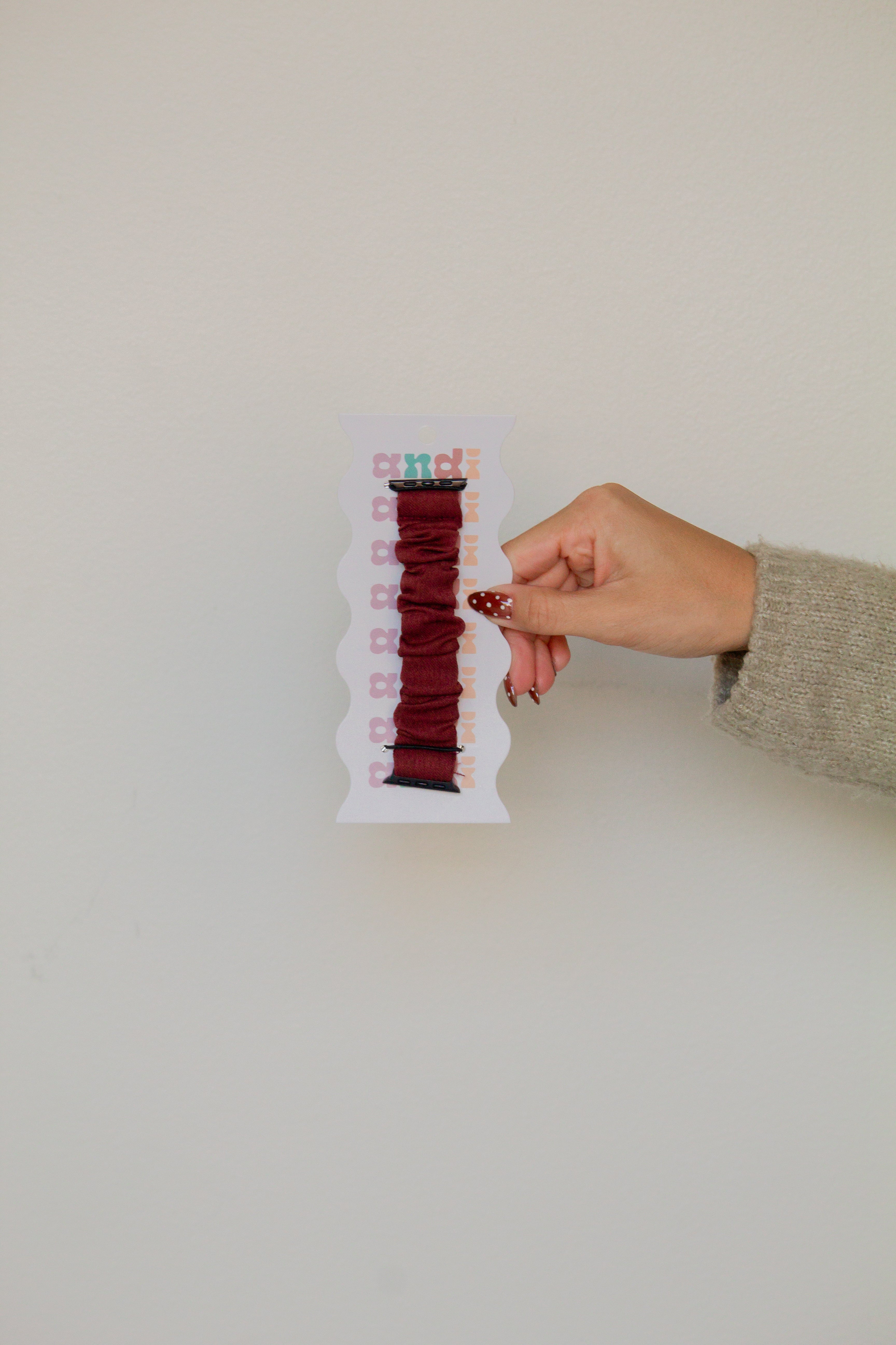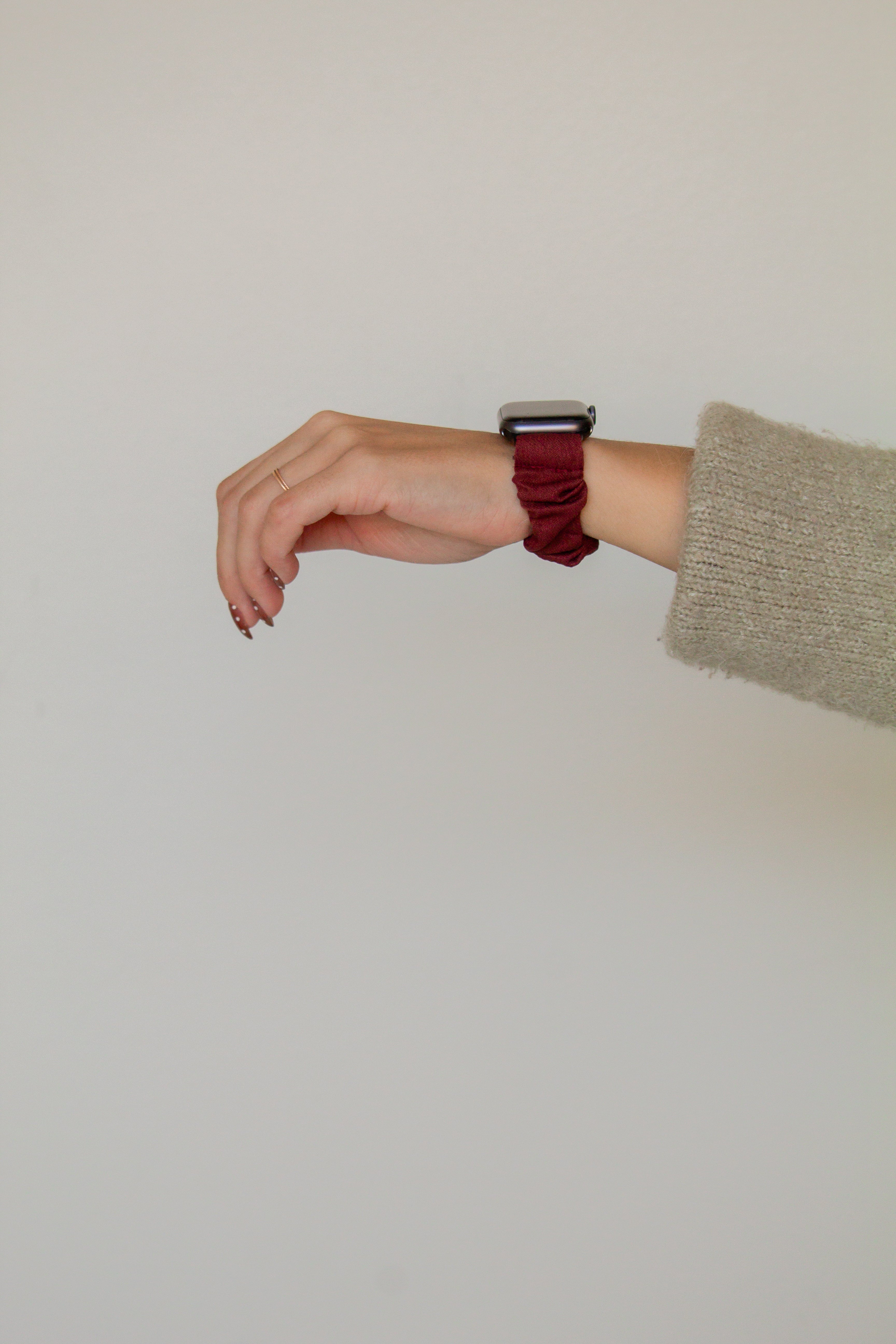 This watch band is made out of a stunning crimson red fabric, that will be nice and durable and hold up very well. This watch band has an elastic band in it and is stretchy but should fit tight against your wrist like a scrunchie would! The connector piece is a black metal that seamlessly matches with any color Apple Watch.