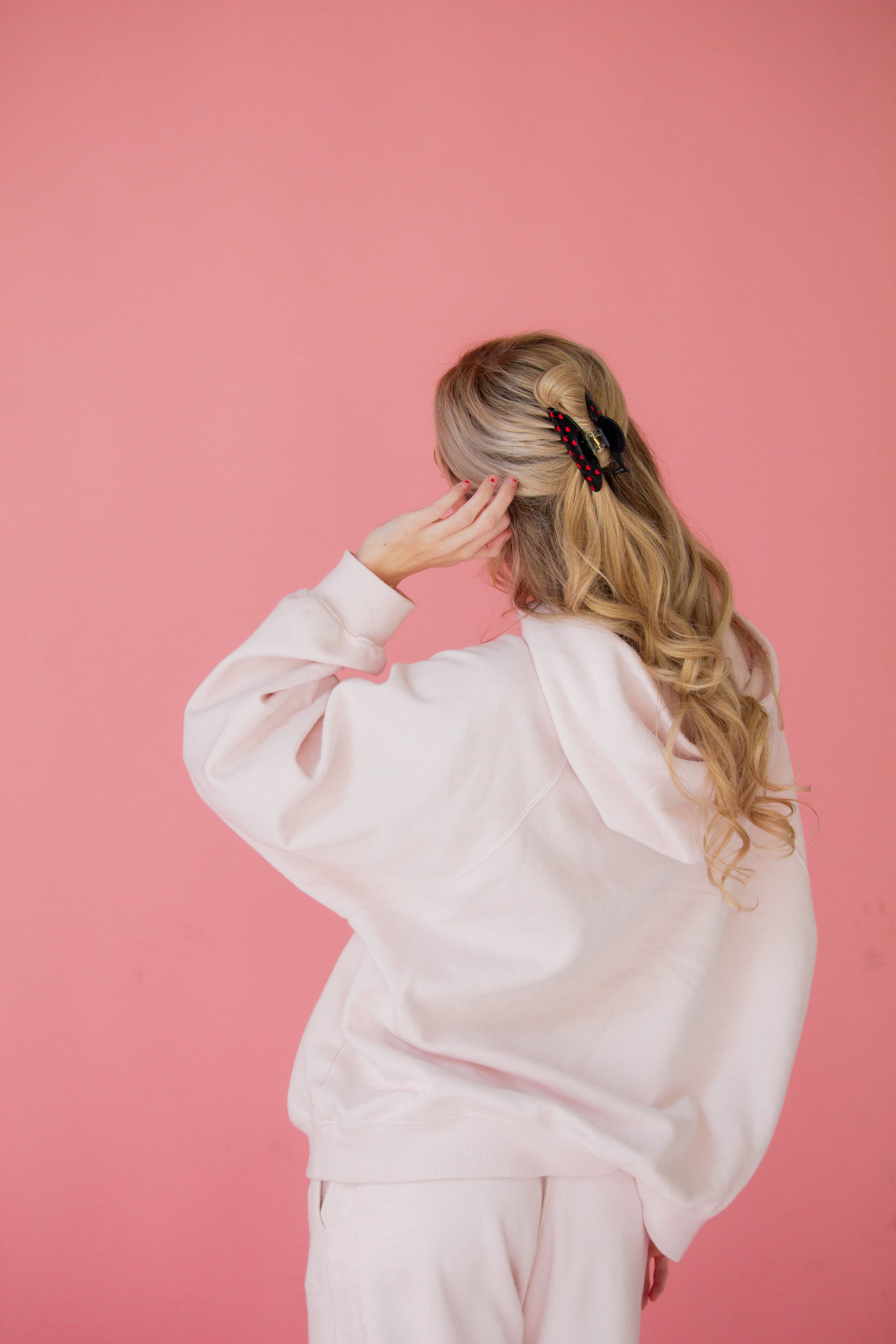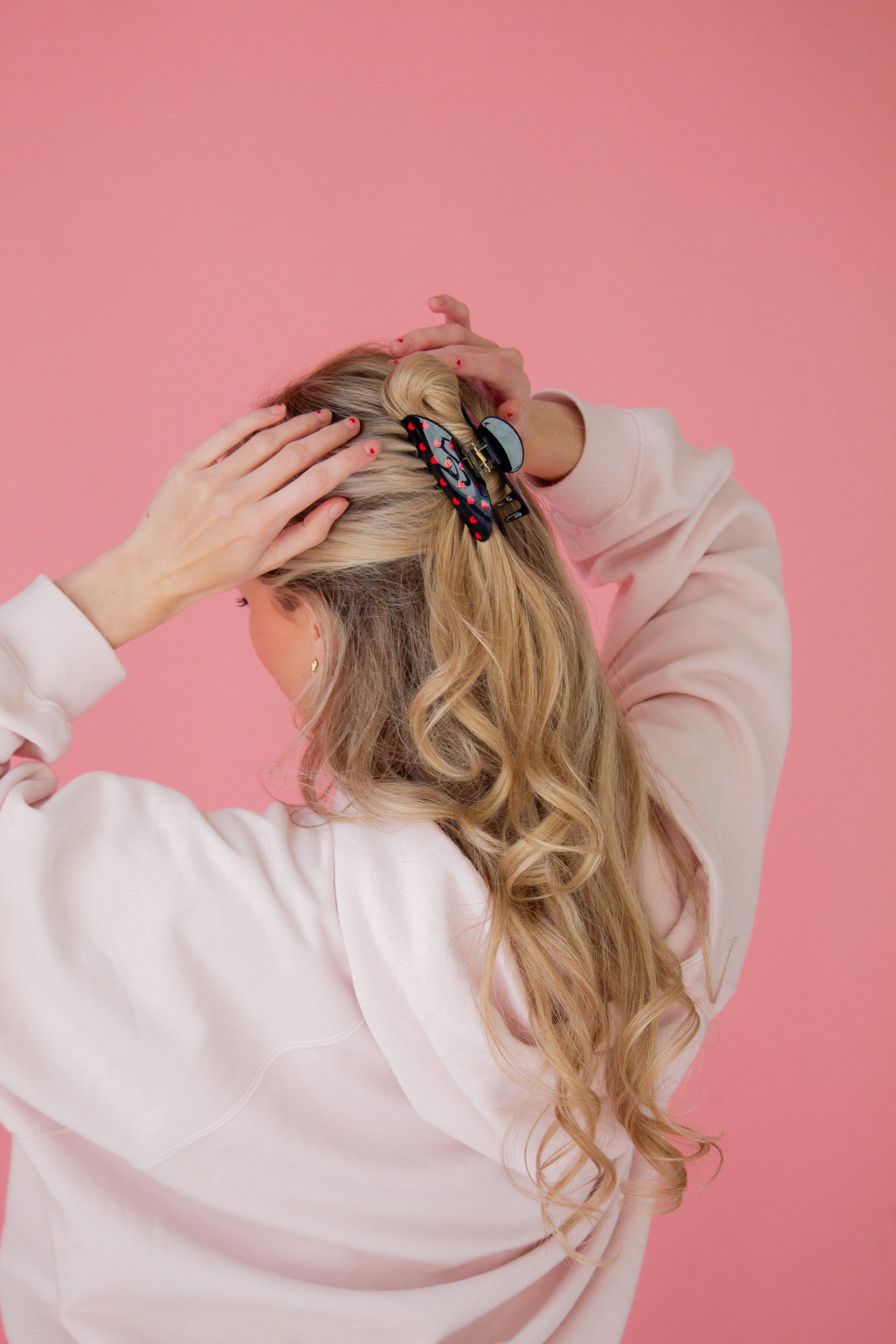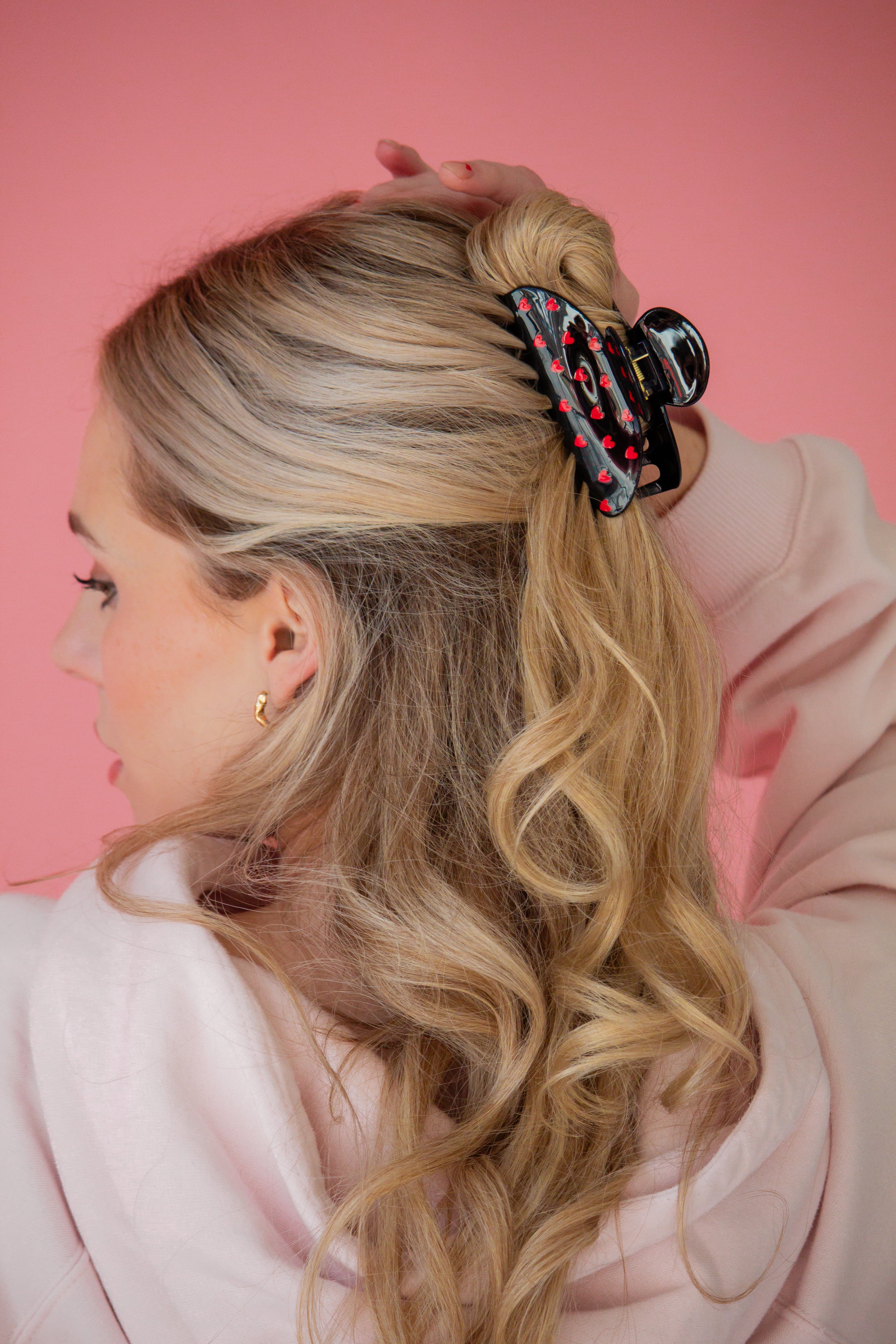 This is a medium size claw clip measuring at 3.5 inches, and is absolutely adorable. Black with red hearts—the perfect clip for Valentine’s Day, and is so fun and unique!