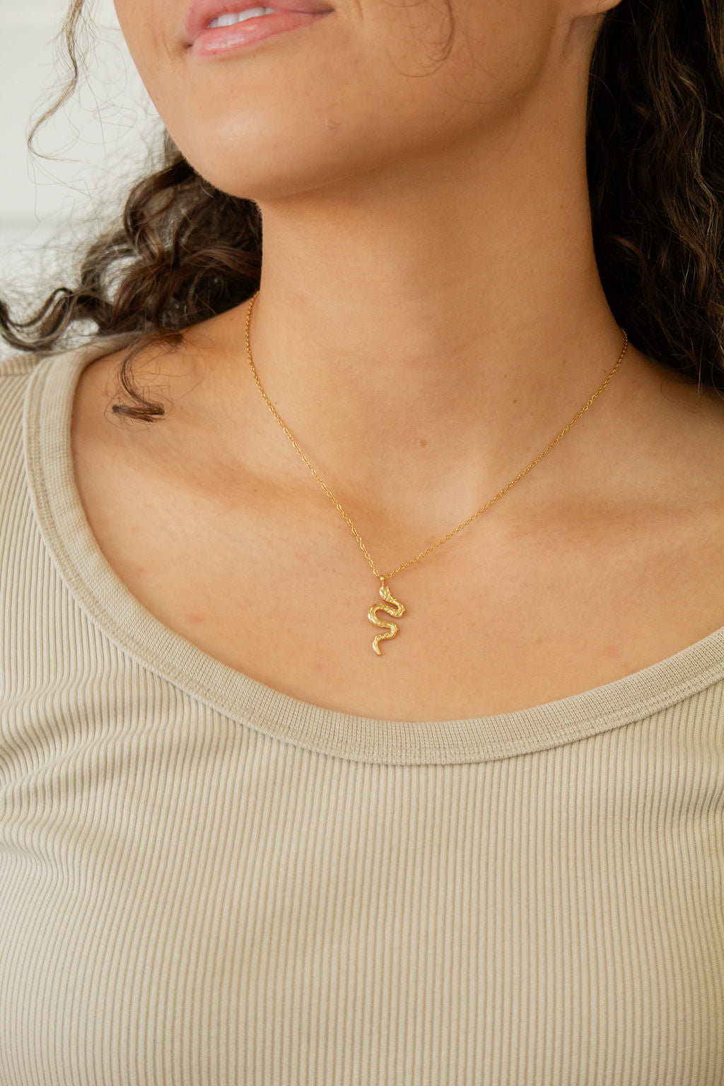 This stunning necklace is the most perfect dainty everyday piece. It's the perfect gold chain with the cutest snake pendant. It is made out of a high quality stainless steel material which means it's water resistant. It makes for the perfect everyday piece that you don't have to take off!