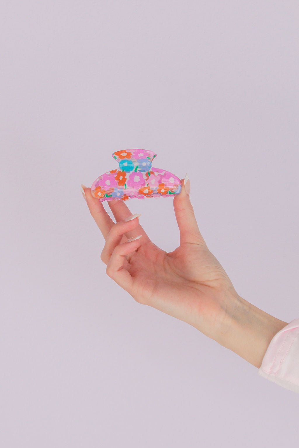 This is a medium size claw clip measuring at 3.25 inches, and is absolutely adorable. It has the prettiest spring colored floral pattern on a clear claw clip!