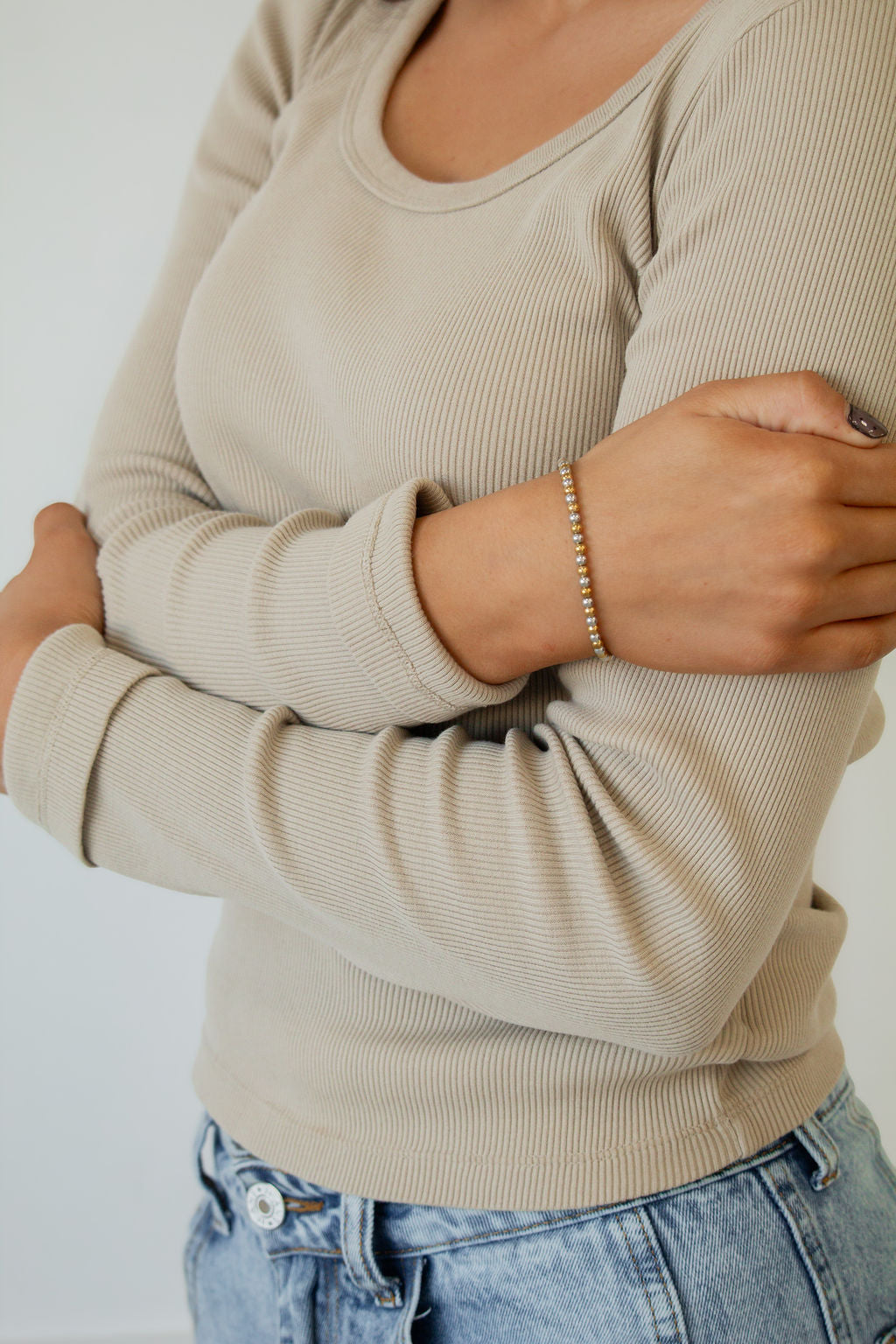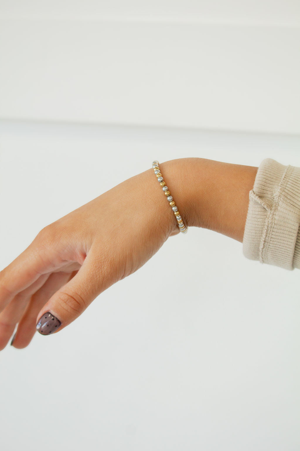 It's a stunning silver & gold stretchy 4mm beaded bracelet that’ll look great with absolutely everything. It's made out of a high quality stainless steel material that is water/tarnish resistant making it perfect for everyday wear.