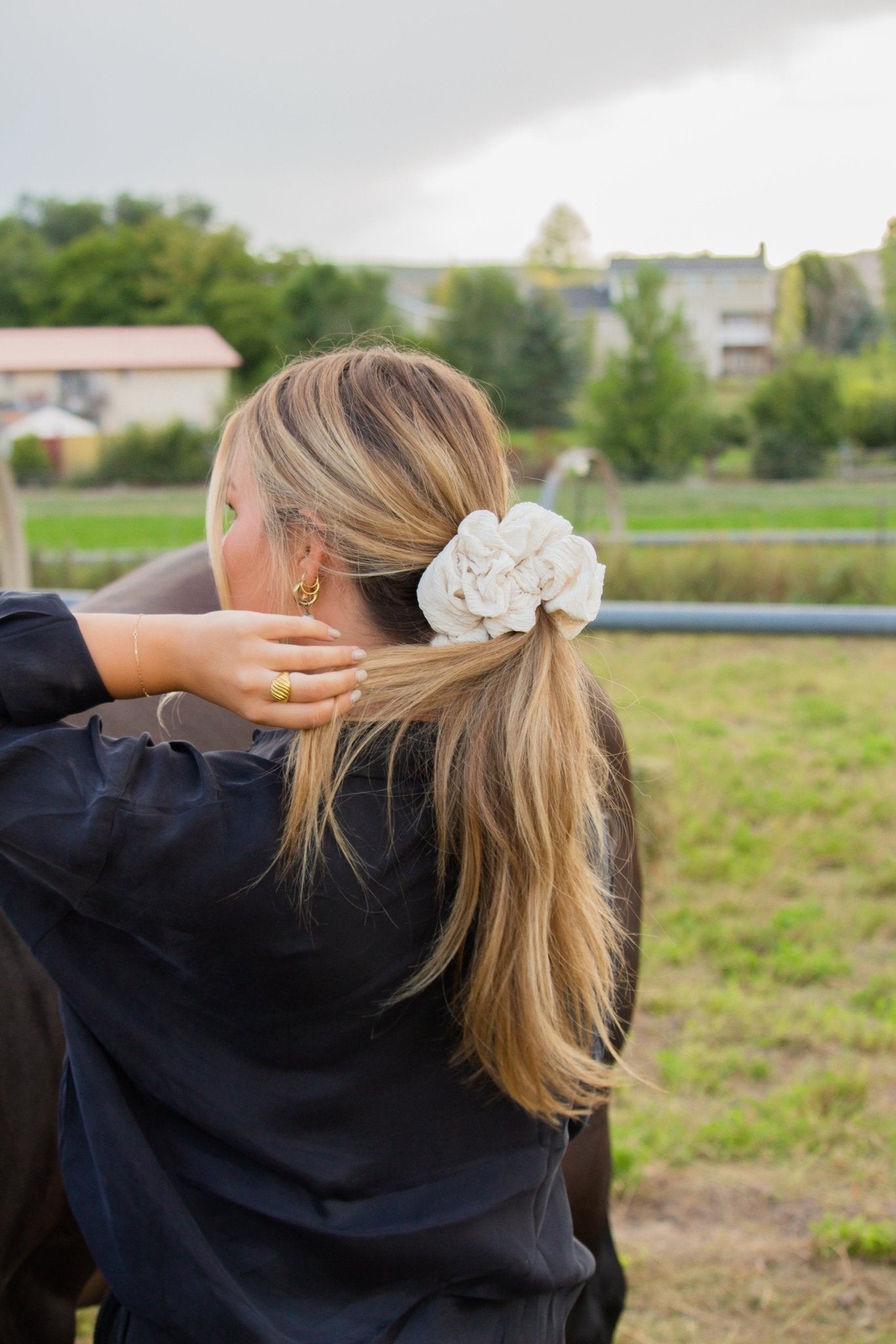 This jumbo scrunchie is made out of a creamy textured material that is to die for. I am obsessed with how big it is and how full it makes your hair look. It's the prettiest neutral color that will match any outfit and look good in every hair color!!! It is a NEEEED. So grab it. now.