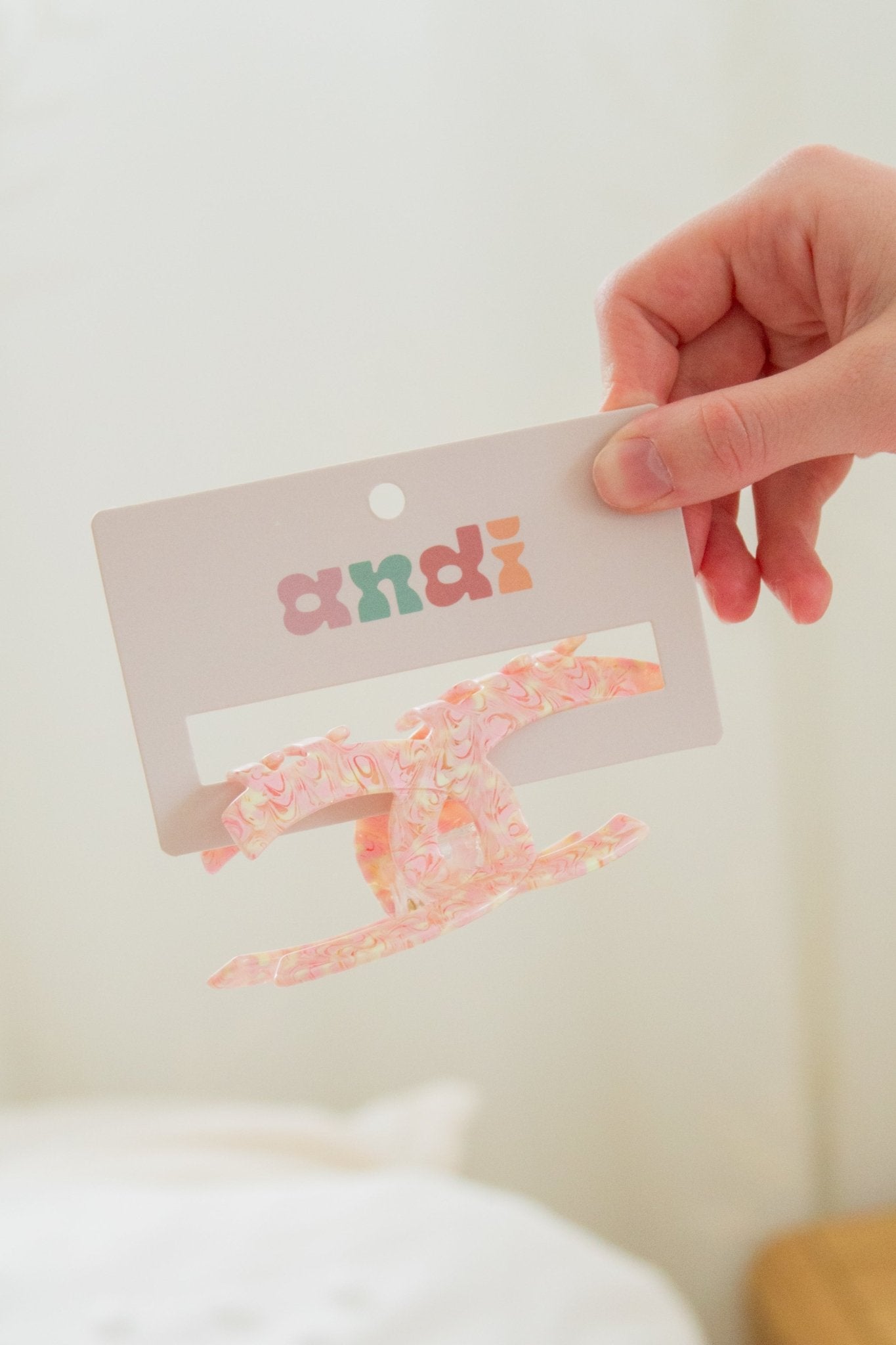 Every Andi claw clip is specifically made to hold your hair as cute as humanly possible, all day long. This claw clip is so fun and unique, its an adorable pink and white marbled acetate in the shape of two linked C's! It's so classy and so fun! Pair this with your favorite sweats, date night dress, or work fit!