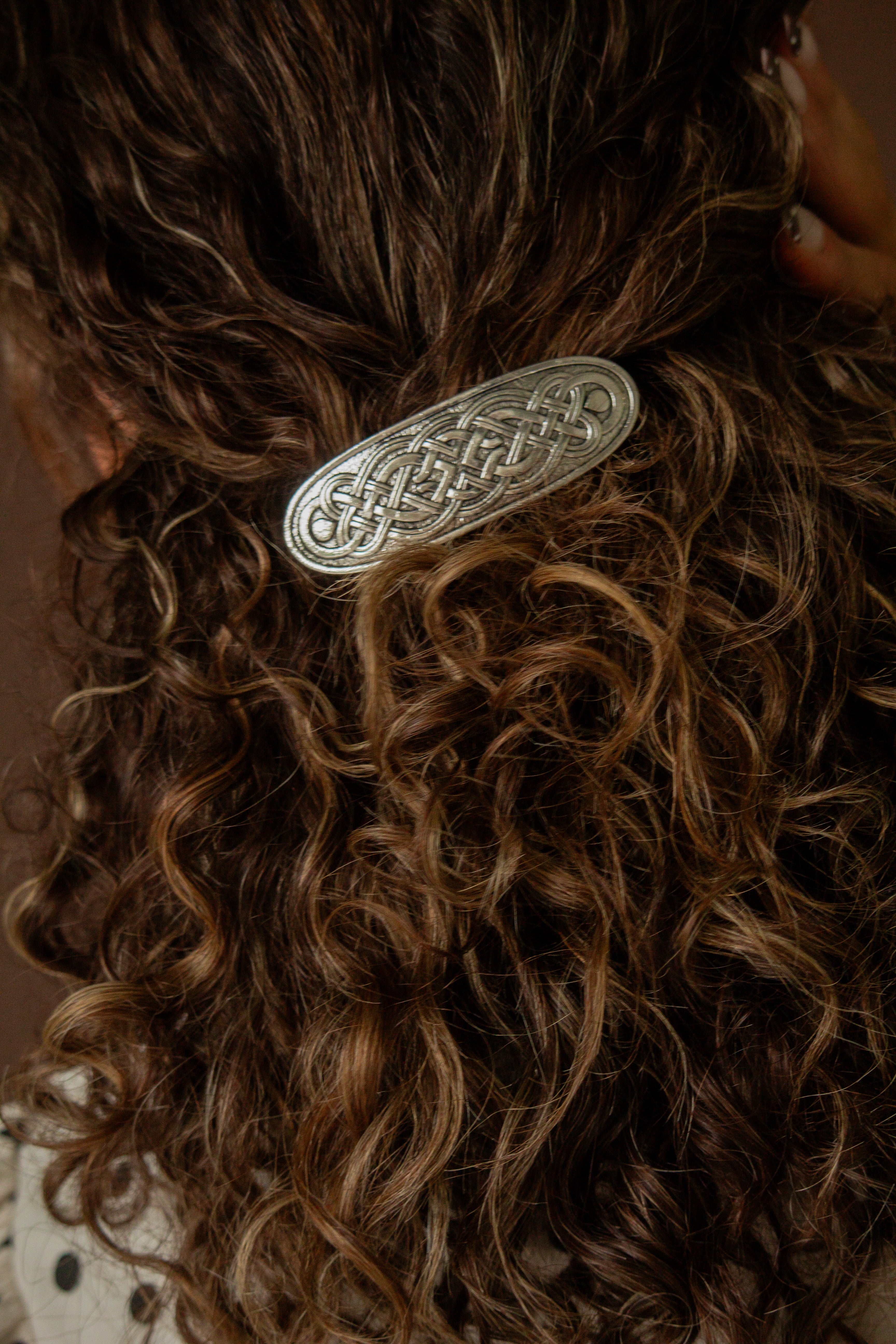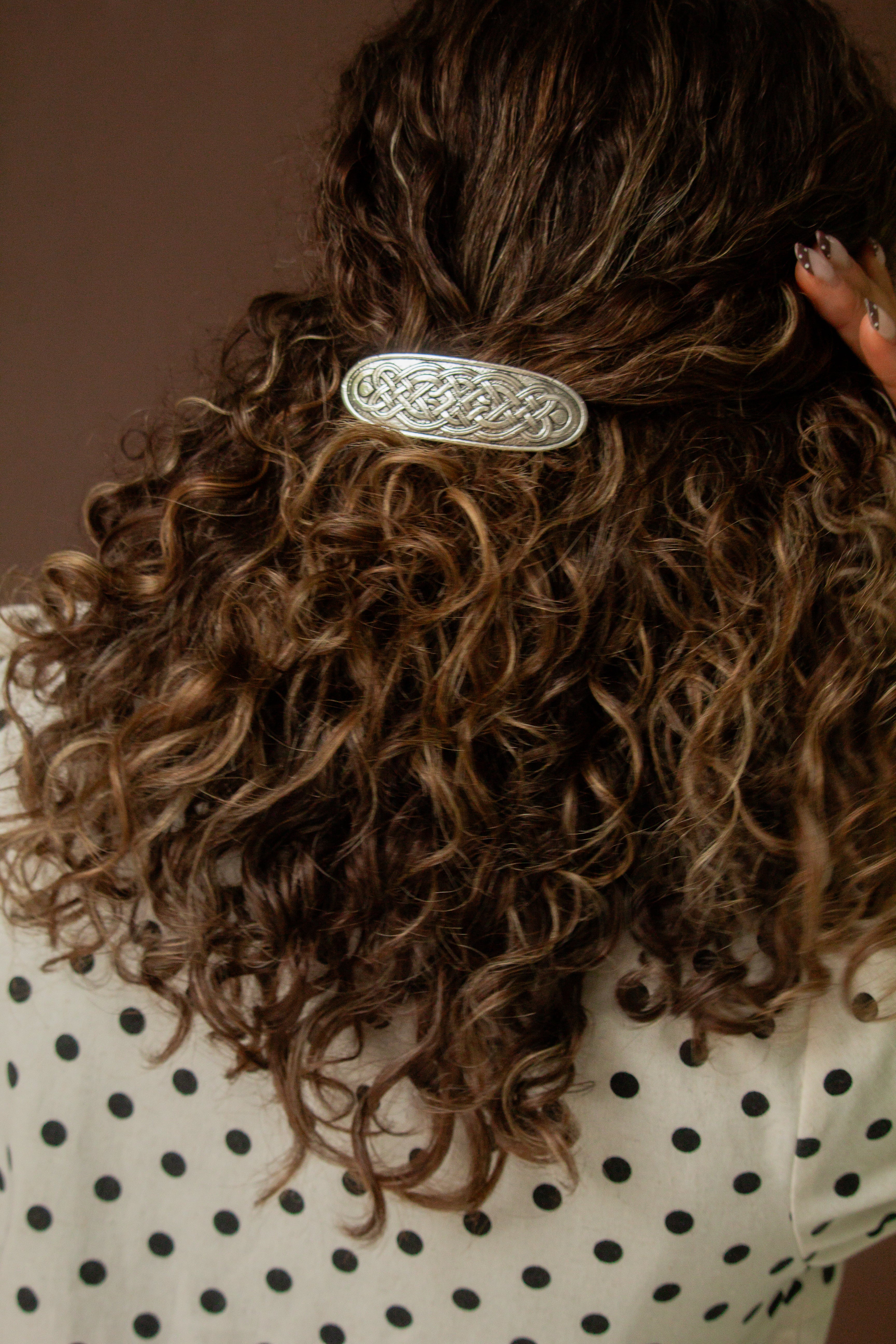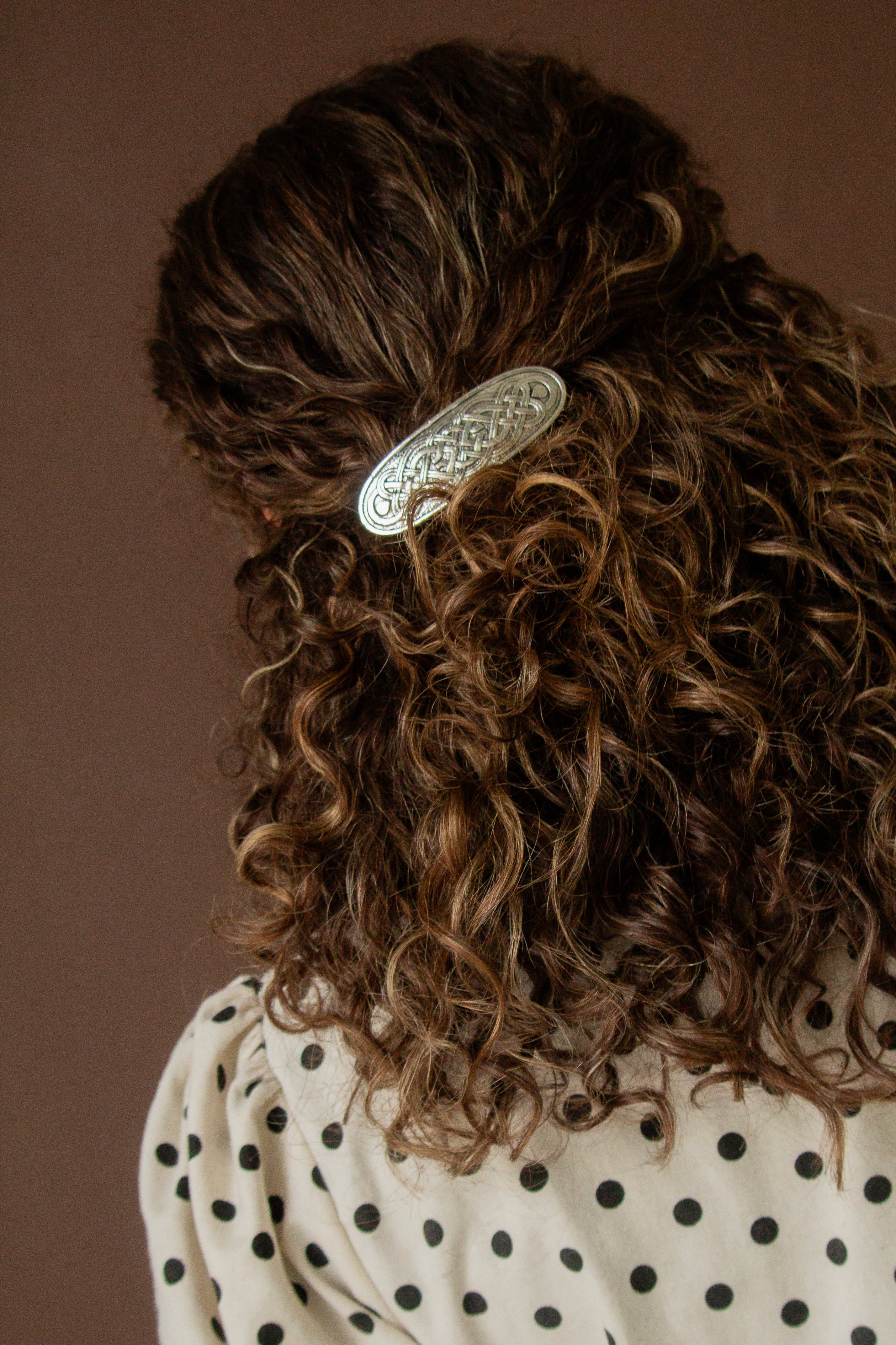 Barrettes are by far the easiest, cutest, and simplest way to style your hair. This barrette is a gorgeous french style, that has a gorgeous curved oval shape. The perfect silver with the prettiest ornate details. It will be your go-to accessory and always have your hair looking its best. This barrette is 3 inches long.