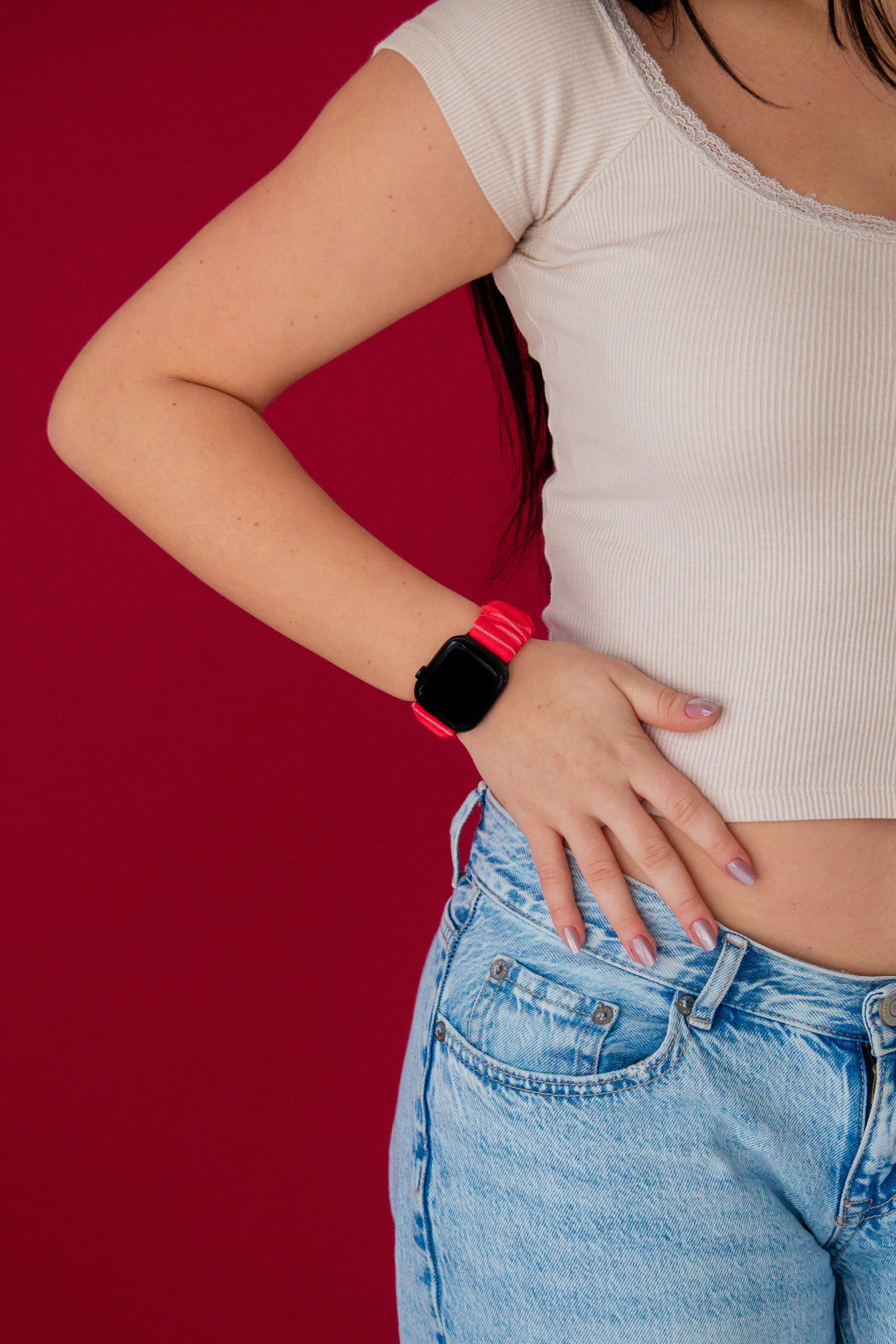 This watch band has the perfect valentine's color combo of red and white, in the cutest striped pattern. This watch band has an elastic band in it and is stretchy but should fit tight against your wrist like a scrunchie would! The connector piece is a black metal that seamlessly matches with any color Apple Watch.
