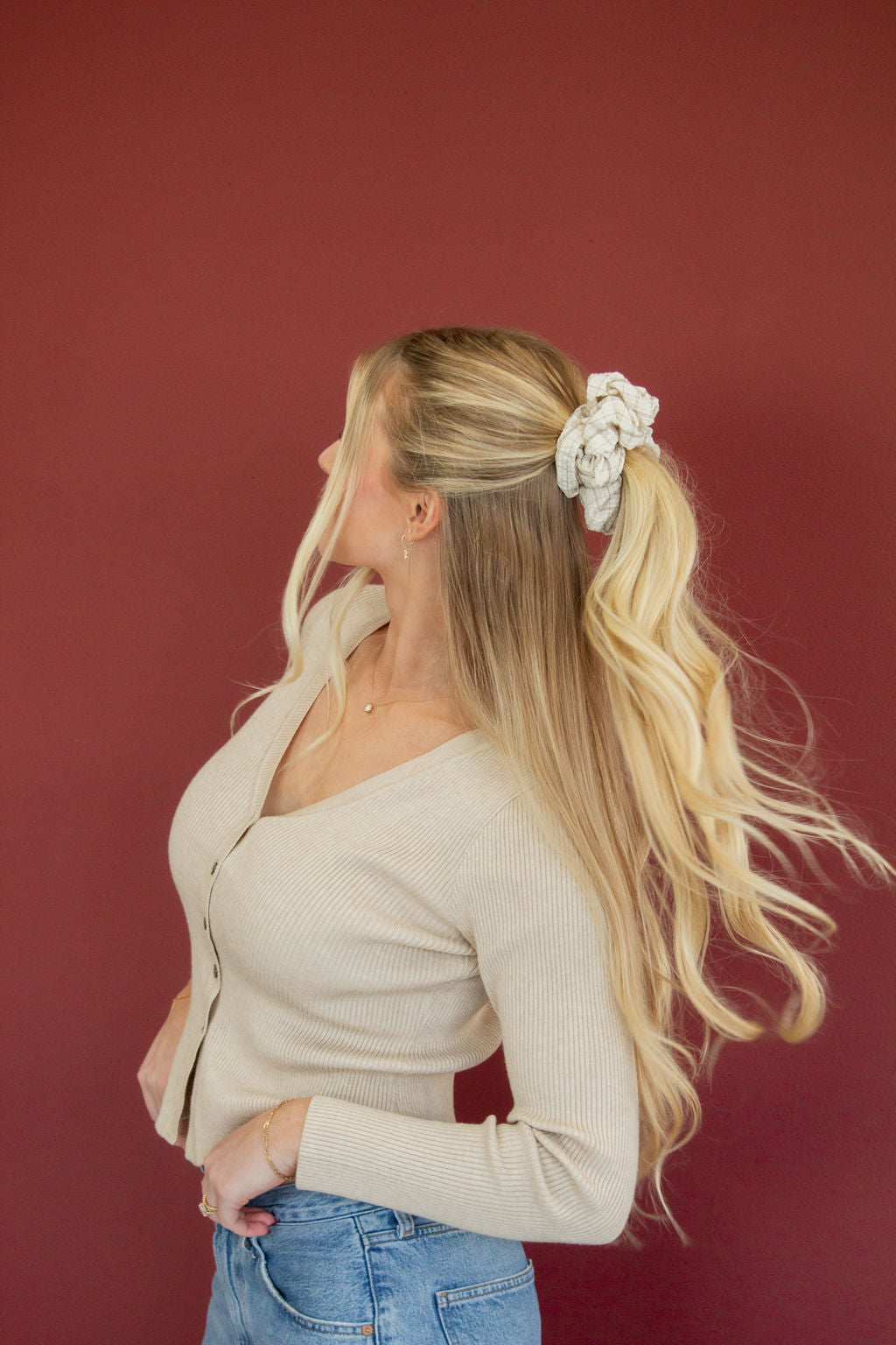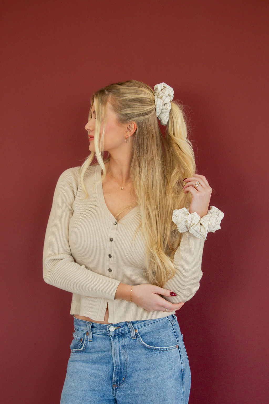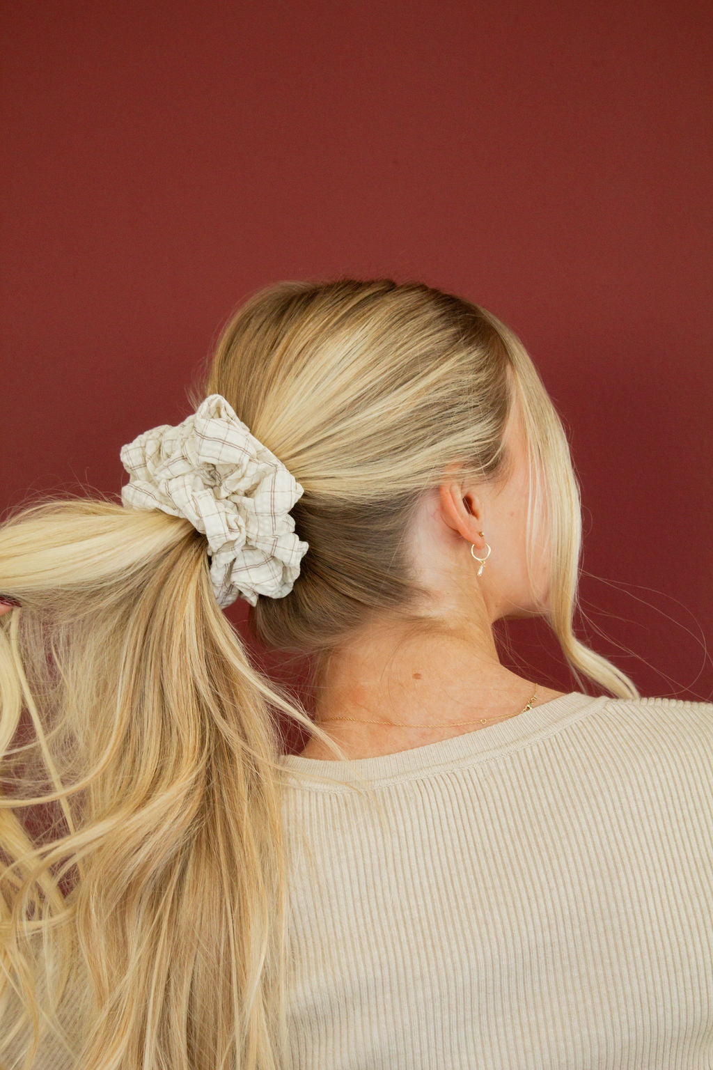 This perfect jumbo scrunchies is from our Andi x Qlov collab. It is made out of a slightly textured fabric and has a minimal tan gingham pattern throughout. I am obsessed with the colors. You'll grab this scrunchie every time because of the neutral colors and perfect hold.