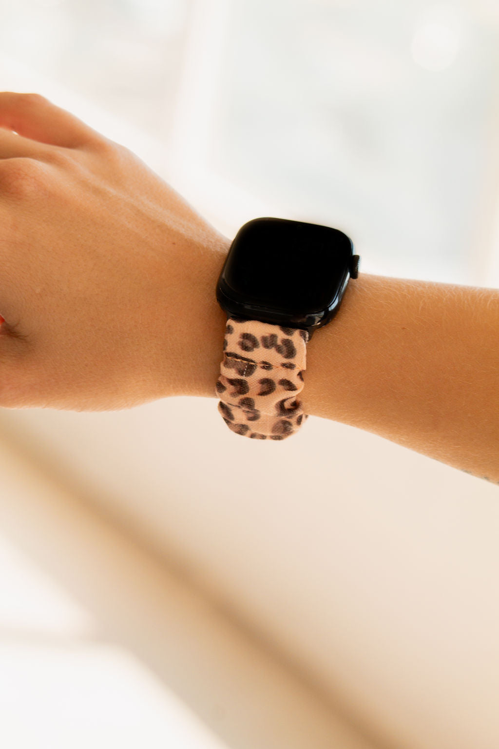 This watch band is part of our Andi X Kaitlyn & Faith collection! It is the perfect cheetah print in the best color combo. This watch band is made out of a linen fabric and has an elastic band in it and is stretchy but should fit tight against your wrist like a scrunchie would! The connector piece is a black metal that seamlessly matches with any color Apple Watch.