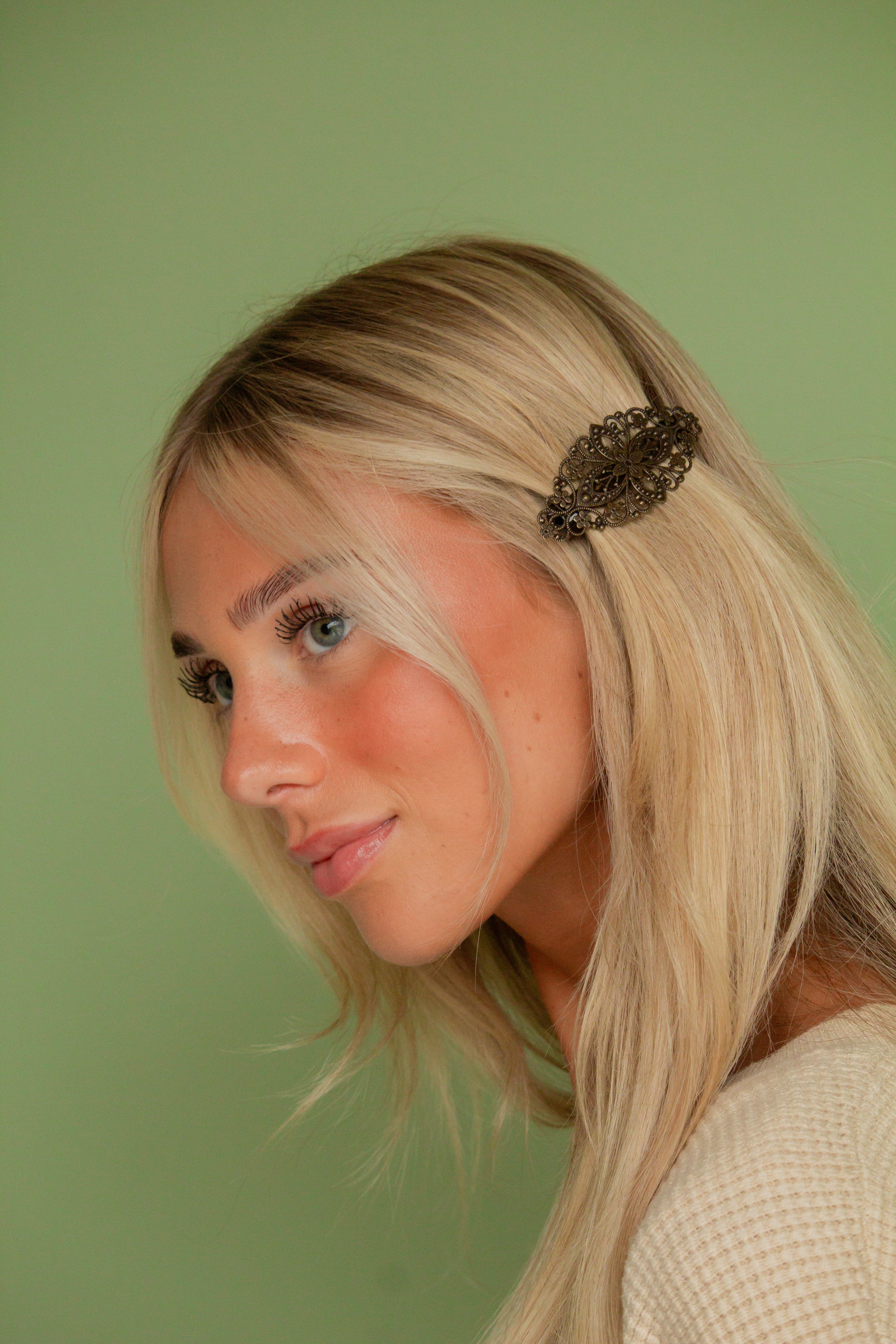 Barrettes are by far the easiest, cutest, and simplest way to style your hair. This barrette is a gorgeous french style, that has a gorgeous curved oval shape. The perfect bronze with the prettiest ornate details. It will be your go-to accessory and always have your hair looking its best. This barrette is 3 inches long.