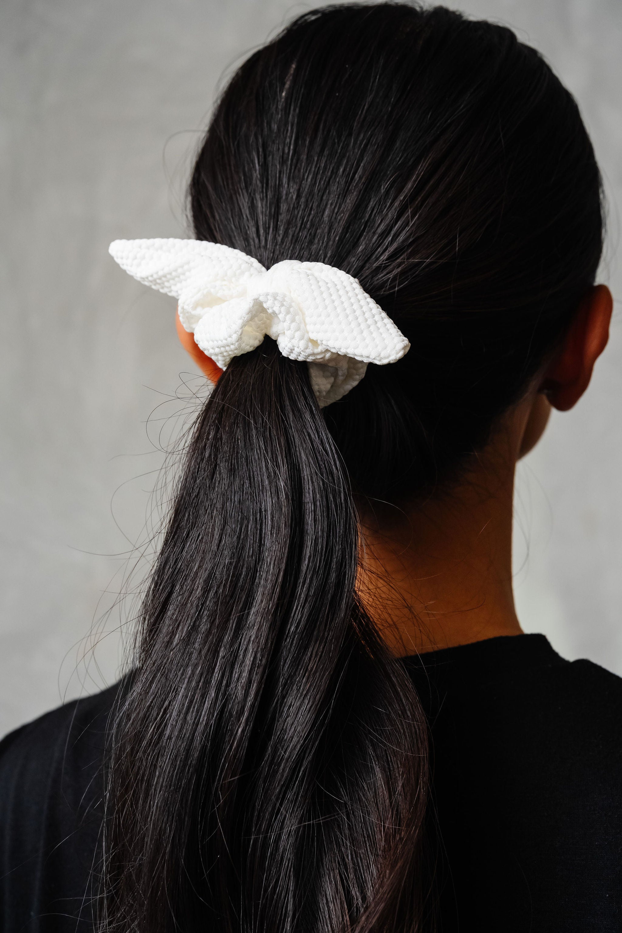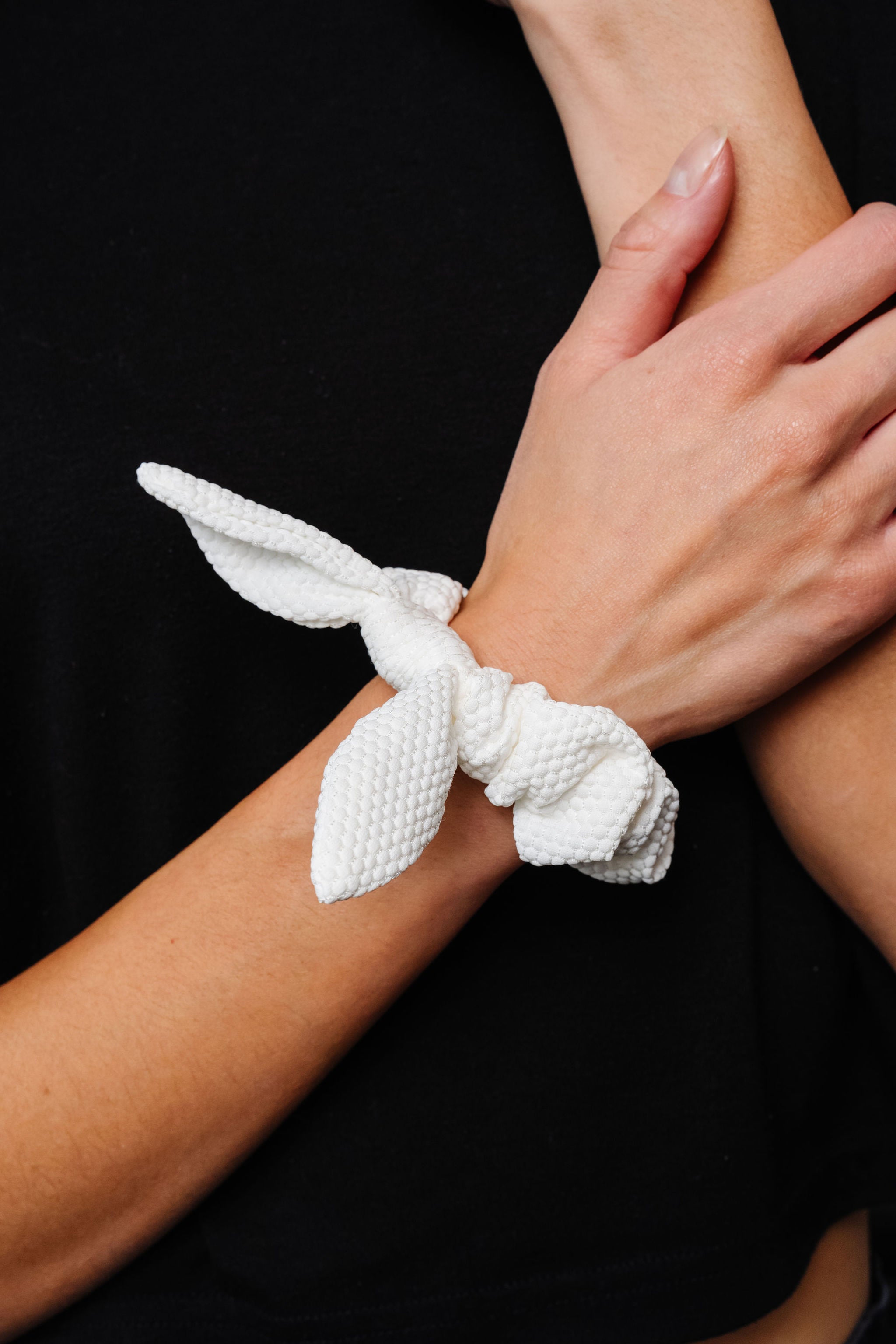 This bow scrunchie is part of our throwback collection--an ode to our very first products we sold here at Andi! In the perfect white, and in a hexagon style athletic fabric, you are bound to love this one. Adorable in every hairstyle, and the perfect breathable fabric for when you're doing anything active.
