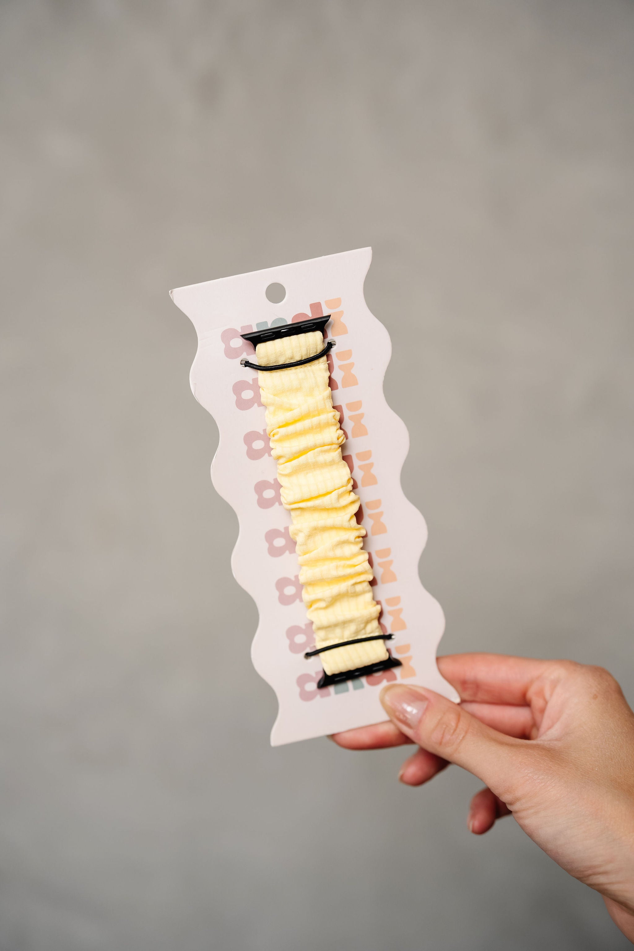This watch band is made out of an adorable, stretchy ribbed butter yellow fabric. This watch band has an elastic band in it and is stretchy but should fit tight against your wrist like a scrunchie would! The connector piece is a black metal that seamlessly matches with any color Apple Watch.