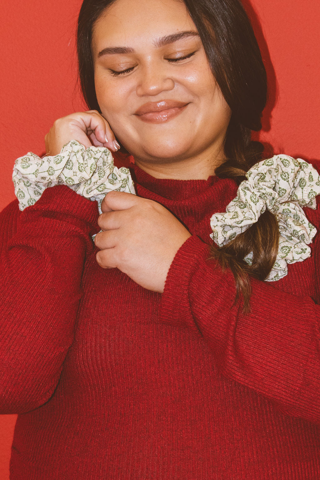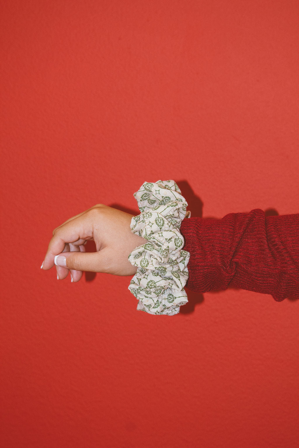 This jumbo scrunchie is the perfect addition to your holiday looks this year! It has a little green vintage looking pattern that resembles ornaments. I love the darker green color and it's a good winter color to match with your outfits.