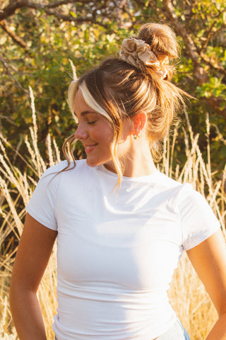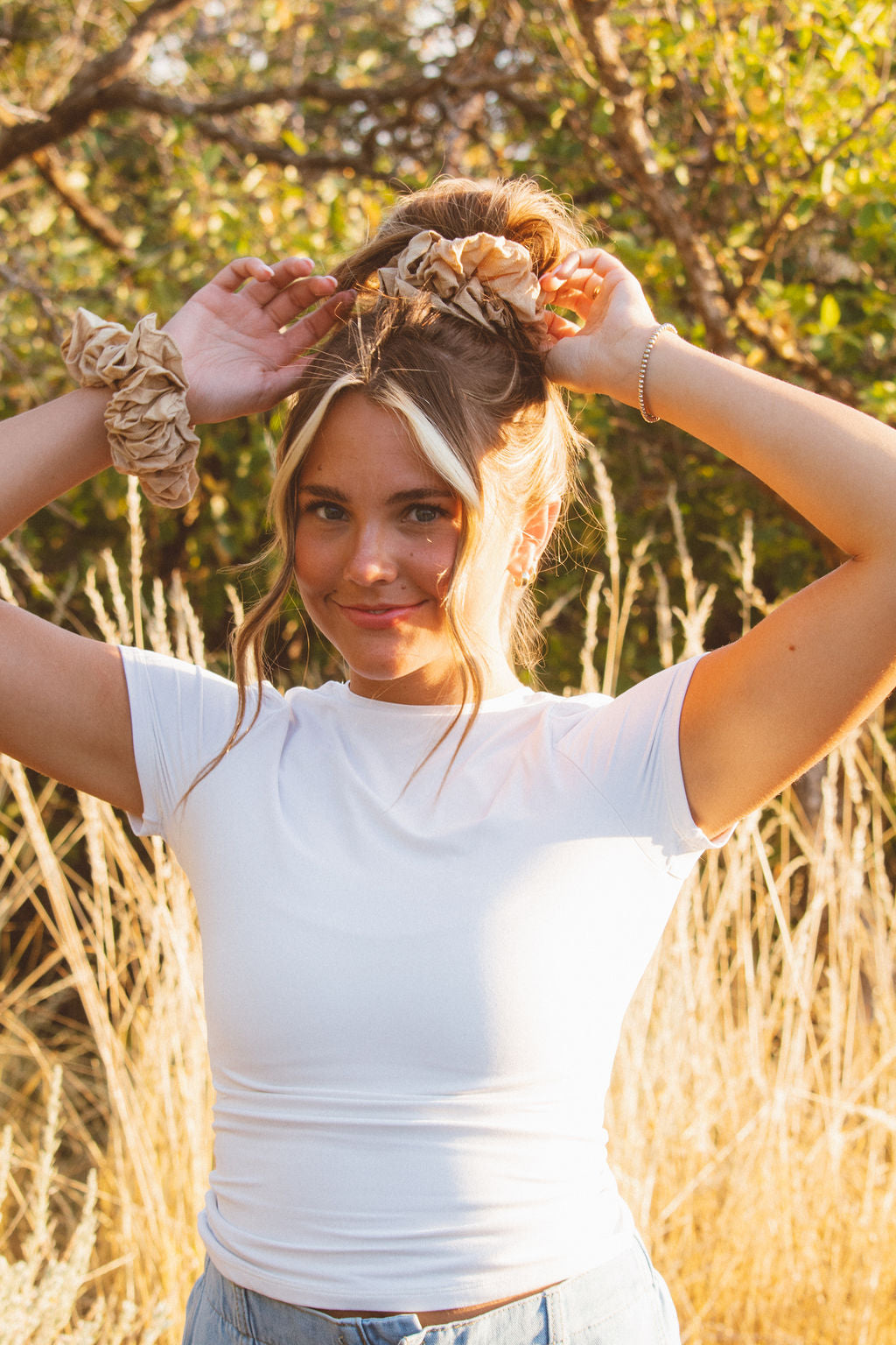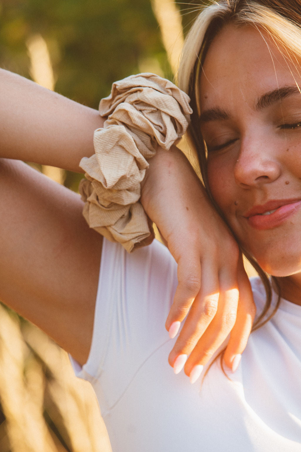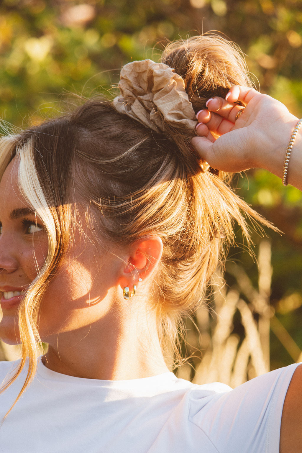 This jumbo scrunchie is the perfect back to school and fall season accessory. It is made in a pretty, sandy colored textured fabric that is nice and lightweight. It'll be the perfect addition to your hairstyles this fall.