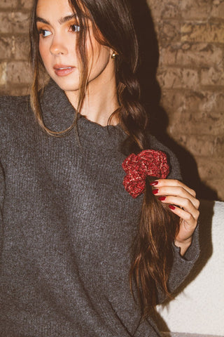 This oversized scrunchie will be the best addition to your closet this season! Made out of a soft velvet and sweater fabric, that comes in green or red and features a gold accented gingham texture, it has the softest feel and is gentle on your hair. It’s perfect for any hairstyle your heart desires and will add a festive touch to every outfit, on any occasion.
