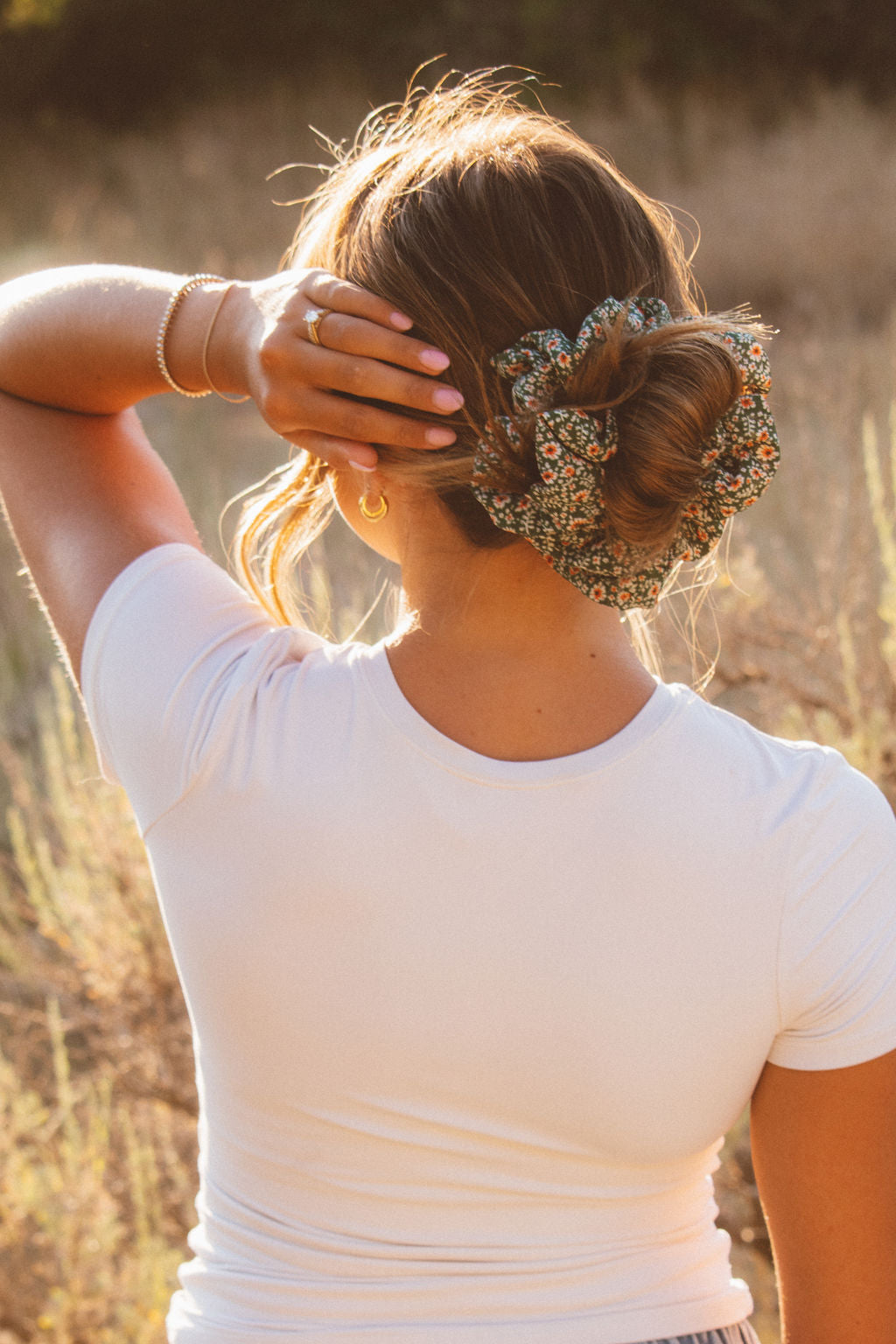 This jumbo scrunchie is the perfect back to school and fall season accessory. It is made in a pretty, green fabric with most perfect floral pattern. It'll be the perfect addition to your hairstyles this fall.
