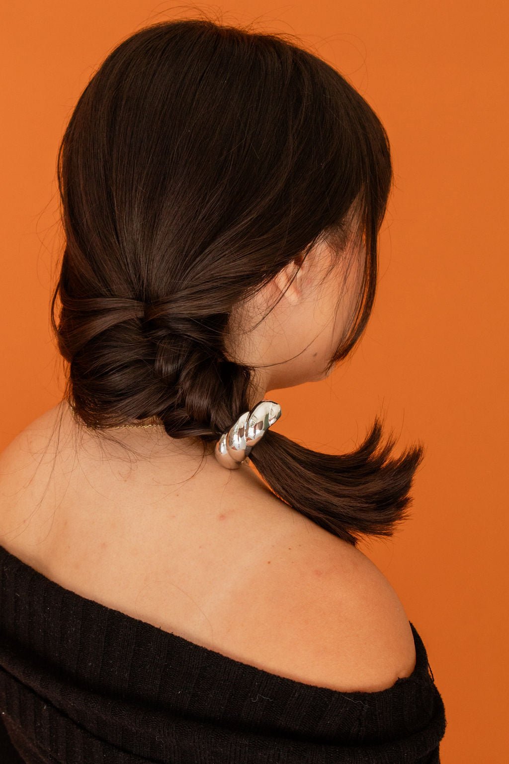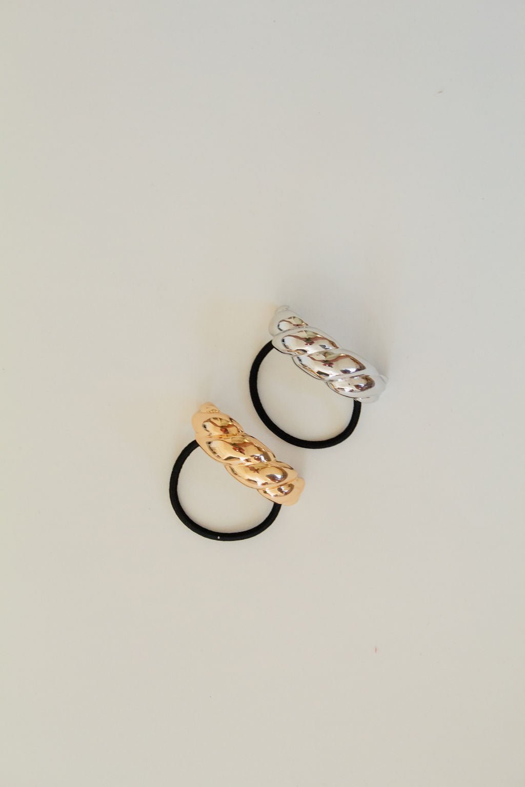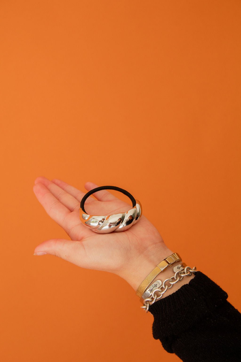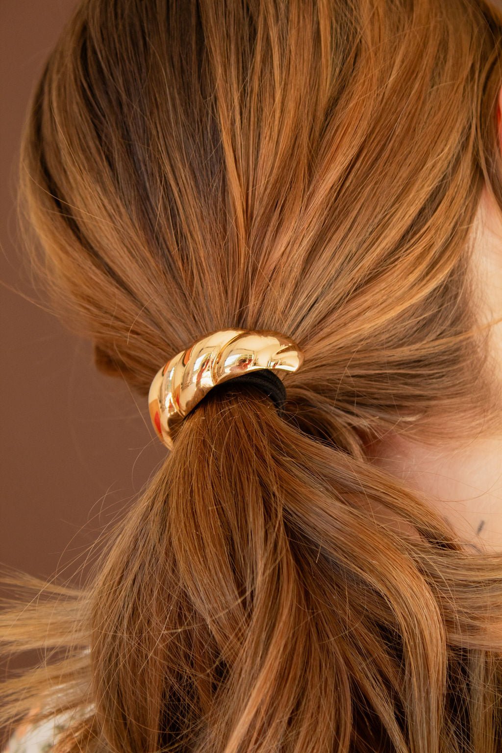 This hair tie will be the best addition to your closet! Made with a black elastic and a gold spiral metal brooch; It will hold your hair better than your average hair tie, and give it the cutest touch while still feeling so simple.